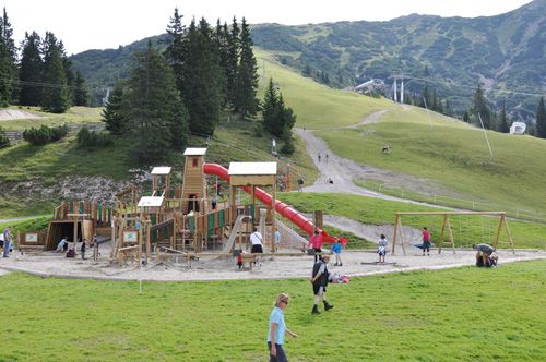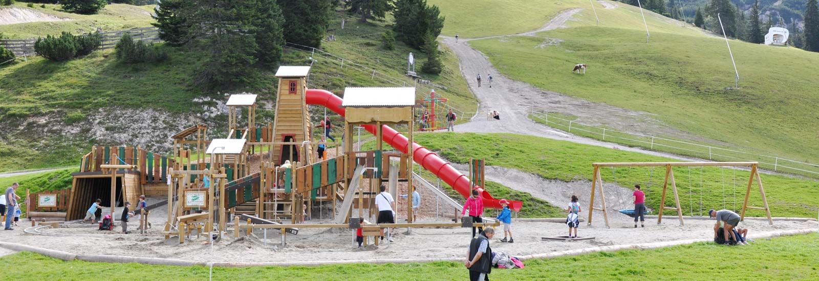 Da in Seefeld, nahe der Rosshütte bis 1964 Ölschiefer unter Tage abgebaut wurde, entschied man sich das Thema Bergbau als Motto für den Erlebnis-Spielplatz aufzugreifen, welches hervorragend zu Geschichte und Region passt. Nach intensiver Planungsarbeit konnte im Frühjahr 2012 dann mit der Errichtung des Spielplatzes begonnen werden. Bis zum Saisonstart war in über 1.762 m Seehöhe, vor der atemberaubenden Bergkulisse Tirols, aus einer großartigen Idee ein eindrucksvoller Kinder-Erlebnisspielplatz zum Thema Bergbau entstanden. Beinahe jedes Spielelement greift eine typische Bergbausituation auf. Neben zahlreichen Fördereinrichtungen zum Sandtransport, mit Weichen und Auskippanlagen, befinden sich ein Stollen, ein weitverzweigtes Schienensystem mit Drehscheibe und Hunt, sowie eine aufregende Röhrenrutsche auf dem Spielareal. Und die kleinen Gäste lieben es, sich im Stollen durch den Sand zu graben, die Förderanlagen und Schienenwege zu nutzen und die verschiedenen Krananlagen zu bedienen, während Eltern und Begleitpersonen die entspannte Atmosphäre im Gastgarten, mit Blick auf den Spielbereich, genießen können.