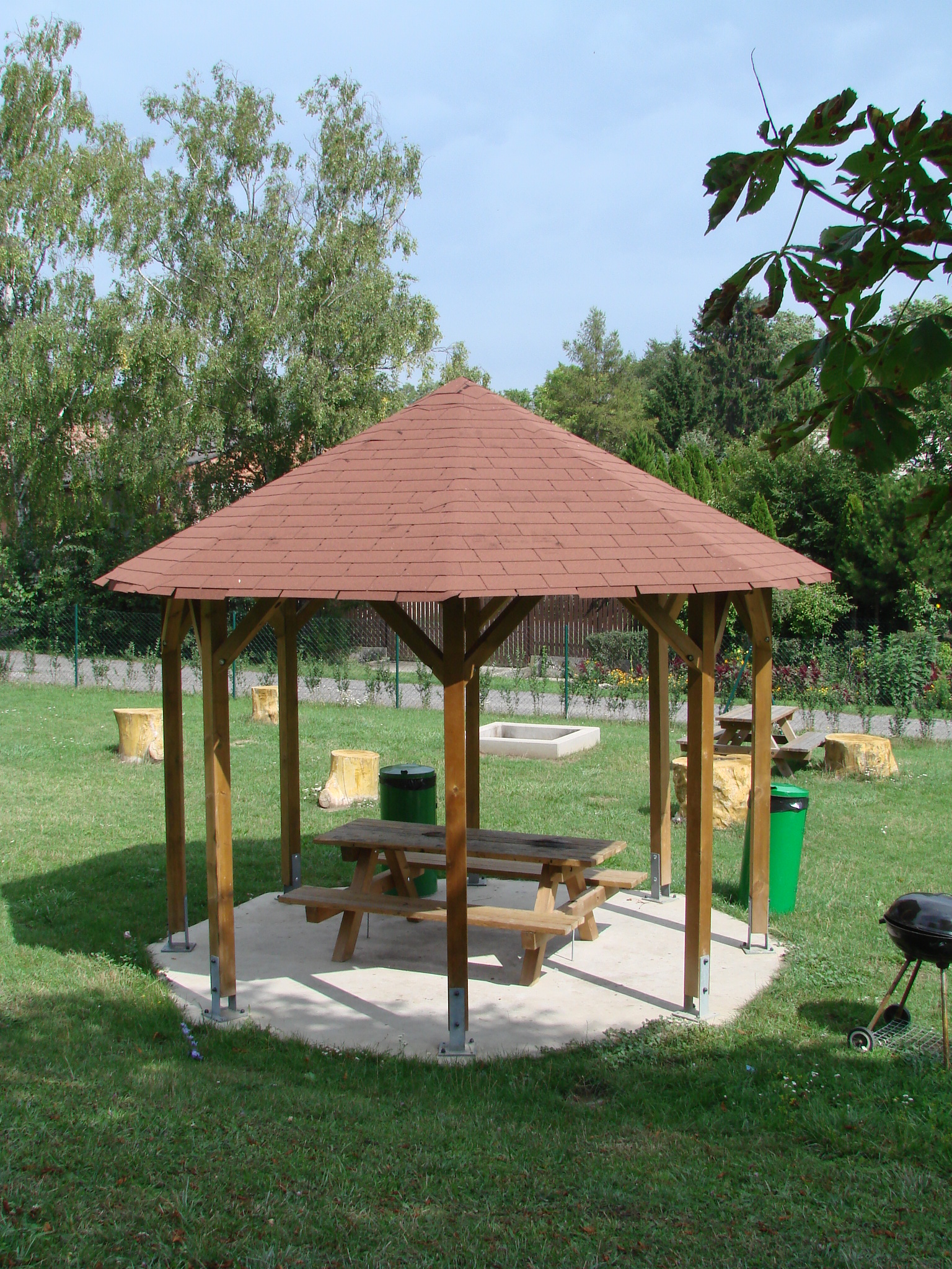 Beschreibung: Pavillon komplett, mit vorgefertigten Einzelteilen, Dach-Elementen sowie Bodenverankerungen, Dacheindeckung nach Wahl, mit Bitumen-Dachschindeln, oder mit verzinktem Blech.