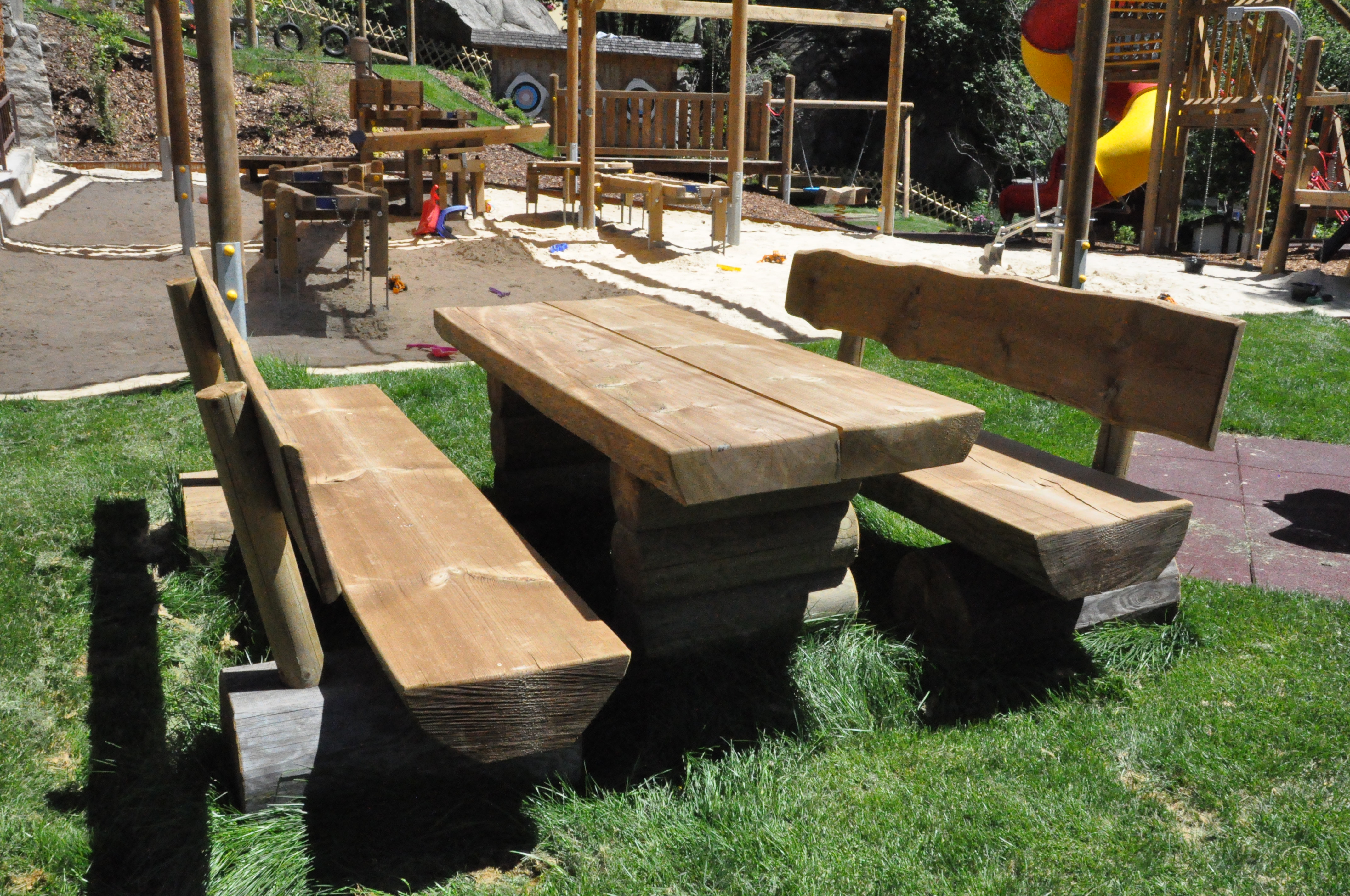bestehend aus: 2 Halbholzbänken mit Lehne, 1 Halbholztisch.