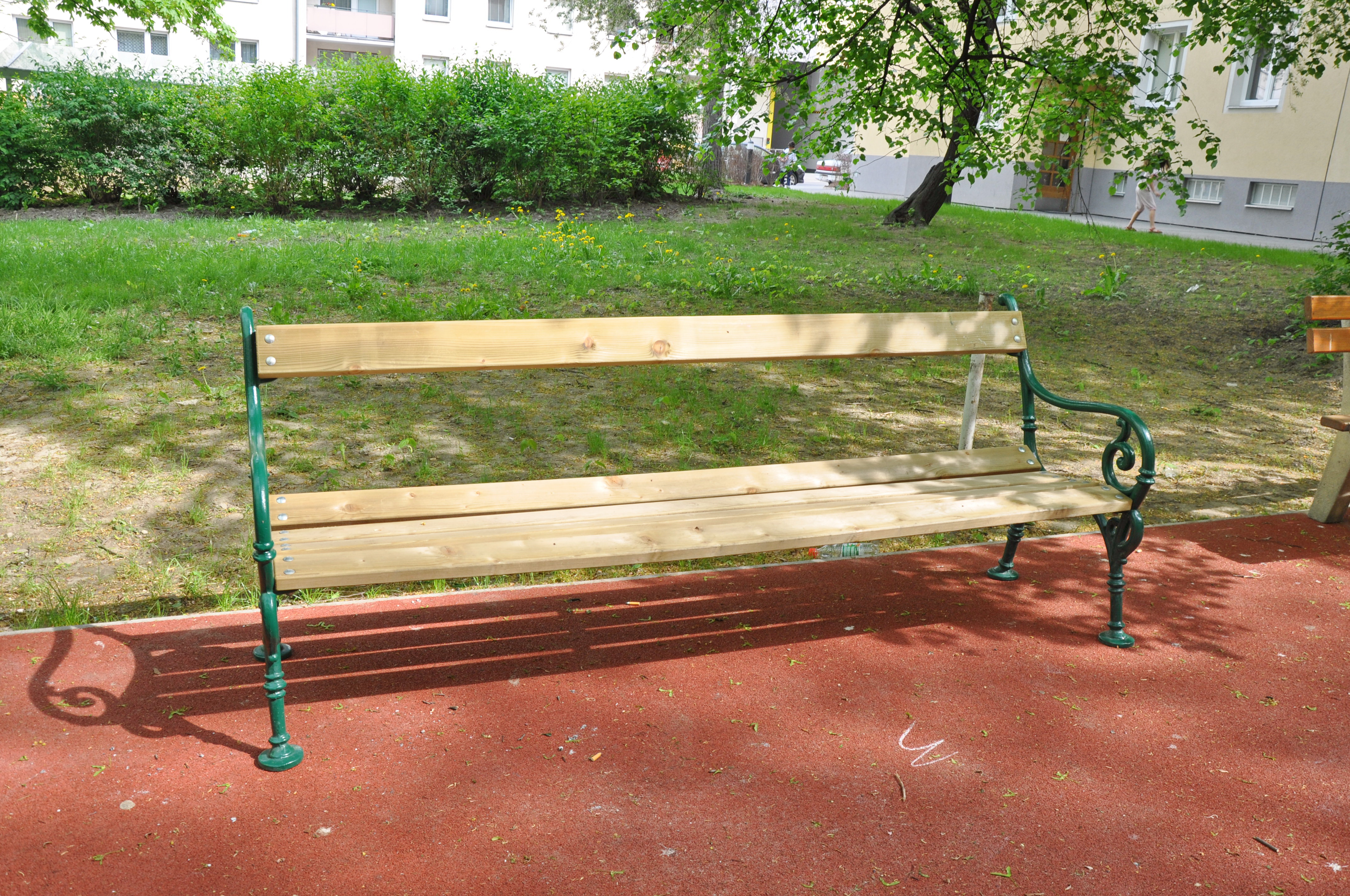 Beschreibung: 2 Gußeisenseitenteile, schlagfest lackiert, grün pulverbeschichtet, RAL 6005. Sitzfläche aus 4 Kanthölzern 3,8/9,6 cm, Lehne 1 Kantholz 4/11 cm, verzinkte Schrauben, fix und fertig zusammengebaut. Breite: 0,65 m / Höhe: 0,42/0,80 m