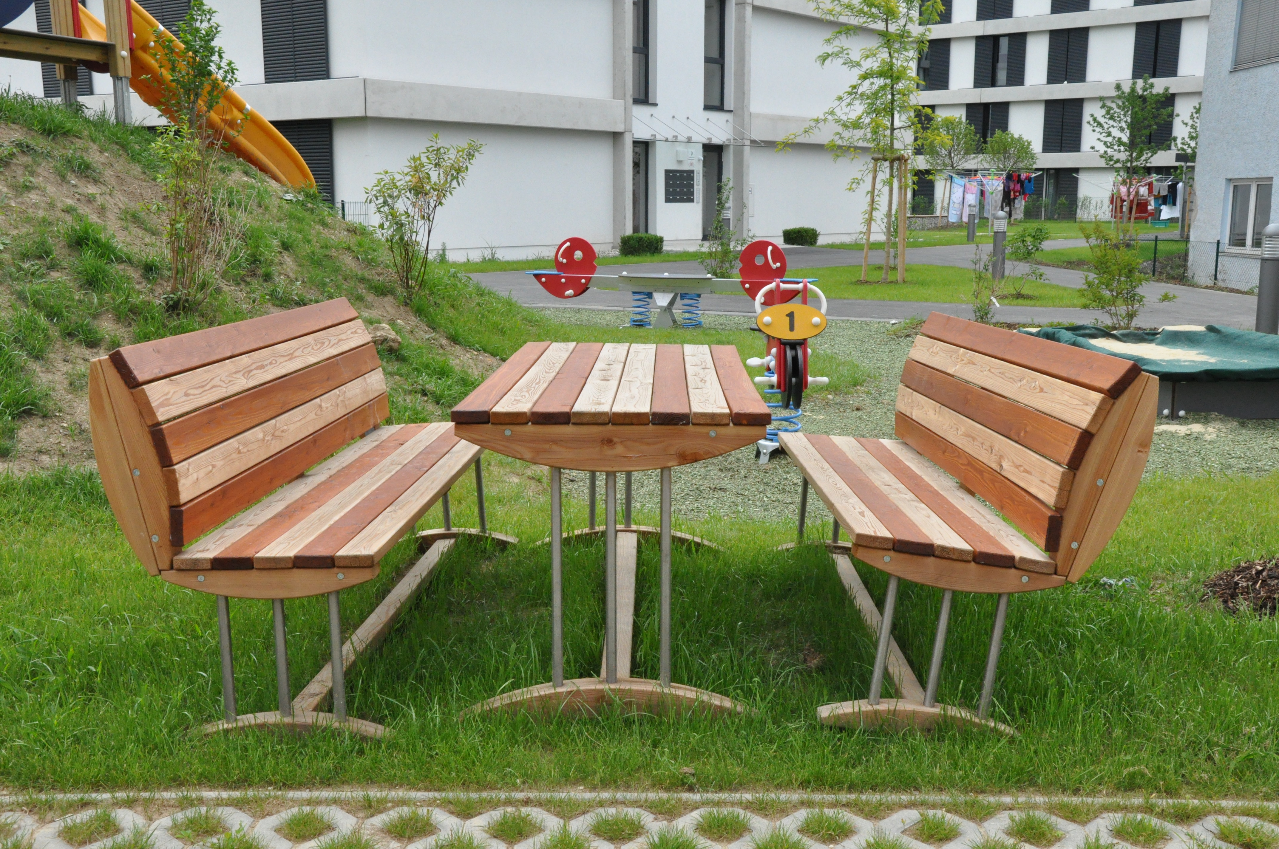 Beschreibung: 1 Tischplatte aus Kanthölzern 3,8/9,6 cm, jedes zweite Holz Kastanie getaucht, Unterzüge und Bankfüße aus Kanthölzern 9/11 cm, mit Segmentbogen, Querstrebe aus Kantholz 7/7 cm, Beine aus Edelstahlrohr Ø 25 mm, Beschläge verzinkt. Länge: 1,70 m / Breite: 0,75 m / Höhe: 0,75 m