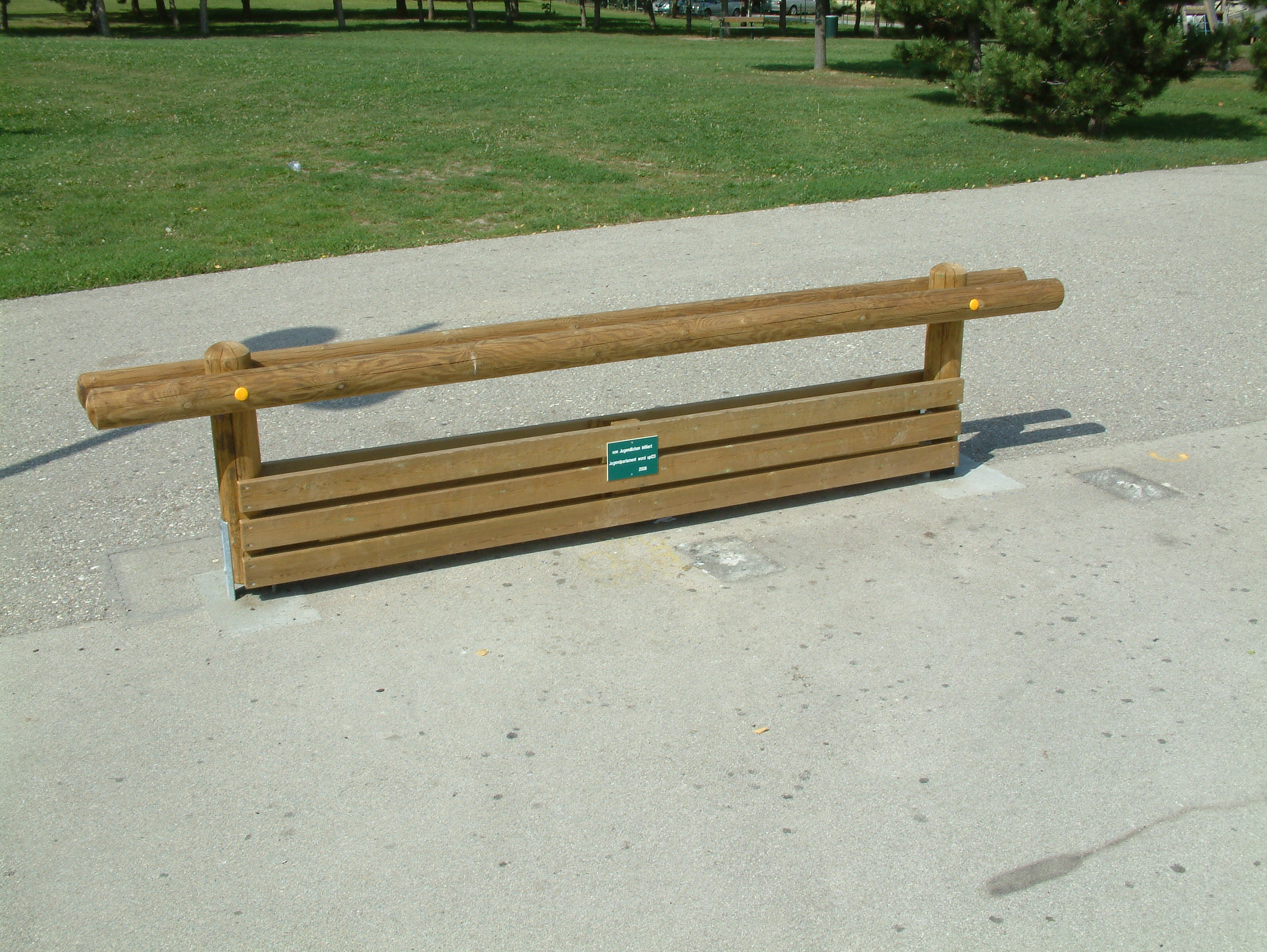 Steher Ø 14 cm, oben gerundet, 2 Sitzhölzer Ø 14 cm, gefräste, kraftschlüssige Holzverbindungen, unten 3 längslaufende Kanthölzer 4/11 cm, zweiseitig angeordnet, sind gleichzeitig Fußstütze und verhindern Durchrutschen von Pucks, Bällen usw.