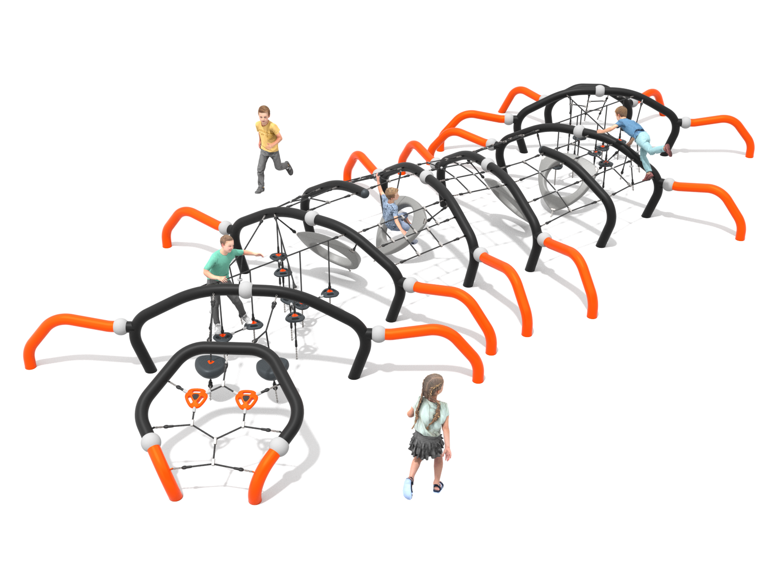 Die Spielanlage "Hundertfüßer" animiert die Kleinsten zum Erkunden und Klettern. Zehn Stahlrohr-Bögen bilden Kopf und Körper dieser Kreatur. Vierzehn Beine, aus Stahlrohren gefertigt, sorgen für einen authentischen Look und laden zum Balancieren ein. Zwischen den Bögen und Streben sind diverse Netze gespannt, die zusätzliche Kletterherausforderungen bieten. Für wackeligen Spaß sorgen die zum Boden hin abgehängten Balancierelemente aus Kunststoffscheiben und große Kunststoffringe an Seilen. Entworfen für Kinder ab 3 Jahren, fördert der "Hundertfüßer" Gleichgewichtssinn und Motorik.