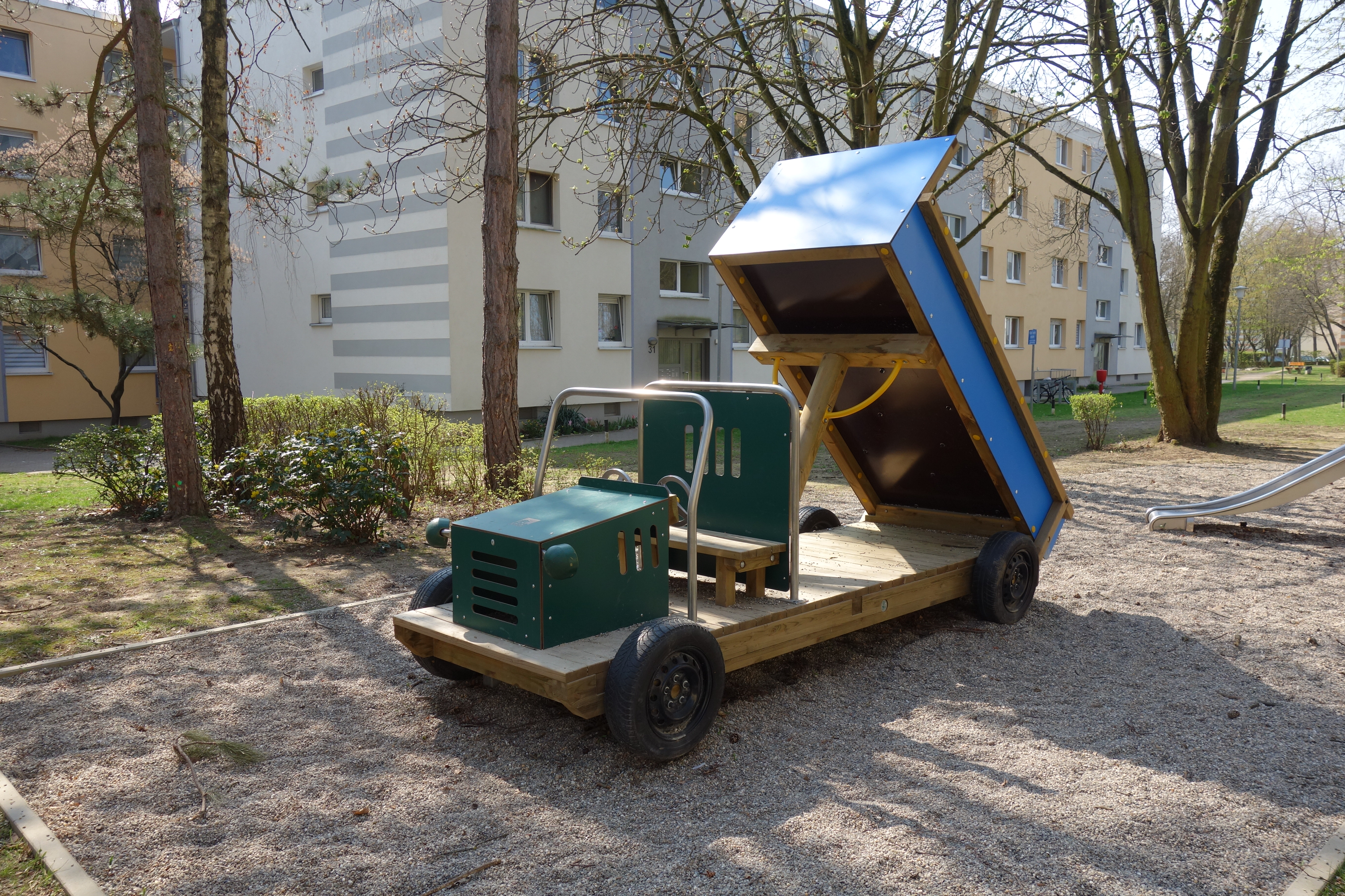 Beschreibung: Fahrgestell mit 4 Rädern aus glatten Altreifen, Hohlräume ausgeschäumt. Tragende Konstruktion aus Kanthölzern 9/17 cm, 4/11 cm, Rundholz Ø 16 cm, Kletterwand beim Kipper aus Siebdruckplatte, Aufbauten aus HPL-Platten, Überrollbügel aus Stahlrohr V2A, 1 Sitzbank, 2 Lenkräder, 2 Lichter.