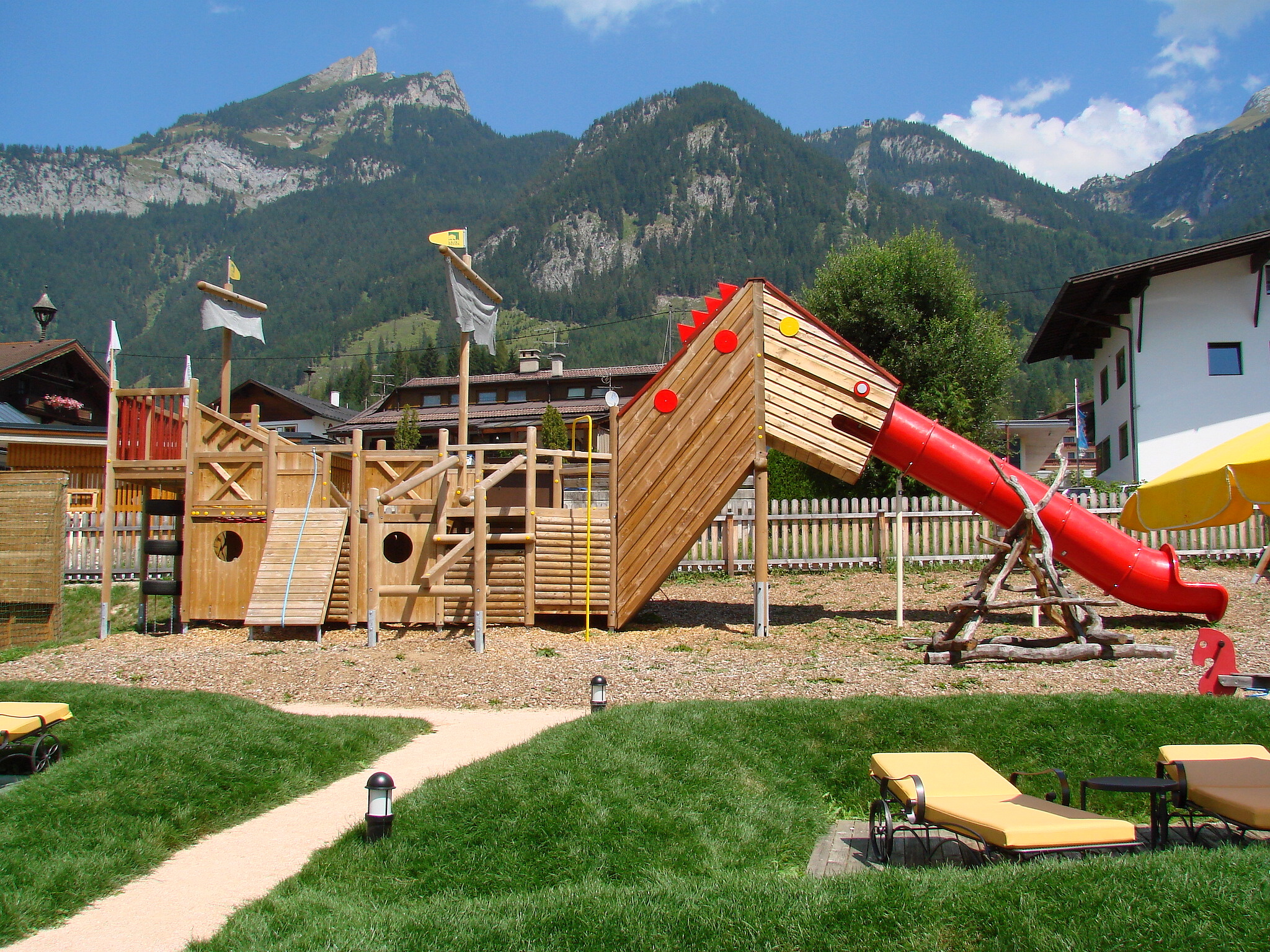 Beschreibung: 22 Steher (Pfosten) aus Rundhölzern Ø 12 cm, 2 Masten aus Leimhölzer Ø 12 cm, mit 2 Segel, Drachenkopf, mit Podesthöhe 2,5 m, geeignet für Röh- renrutsche, mit Stützkonstruktion aus Rundhölzern Ø 16 cm, Schiffsdeck aus Systempodesten, 8 quadra- tisch, 3 dreieckig, mit Leiter-Abgang unter das Deck, 1 Podestnetz, 1 erhöhtes Schiffsheck, mit Steuerrad drehbar, aus Siebdruckplatte, 1 Reifen-Trichter, 1 An- schlussmöglichkeit für Röhrenrutsche im Heck, bei-derseits 4 verschiedene Brücken und schräge Aufstiege auf das Deck, Ein- und Ausgänge in den Schiffsrumpf, im Rumpf labyrinthartig angeordnete Spielwände.
