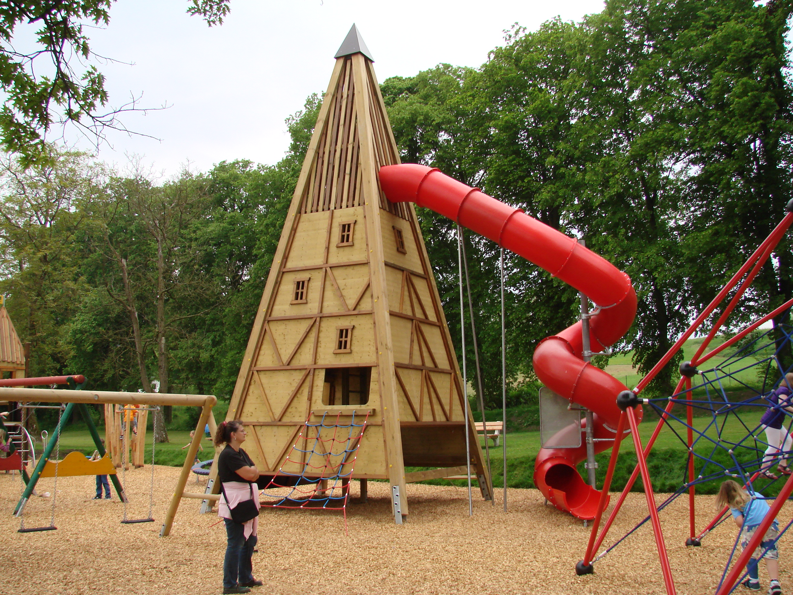 Das Innere dieses Pyramidenturms Maxi kann über 4 verschiedene Aufstiege erreicht werden. Die Podestebene I über eine außen liegende Kletterwand oder über die im Inneren zentral liegende senkrechte Leiter. Über diese können auch die weiteren 4 Podestebenen erklommen werden. Ein außenliegendes Aufstiegsnetz, sowie über einen außenliegenden Balken-Kettenaufstieg ermöglichen den Zugang zur Podestebene II. Darüber hinaus bietet Die Podestebene VI des Turms die Möglichkeit für den Anschluss einer Röhrenrutsche.