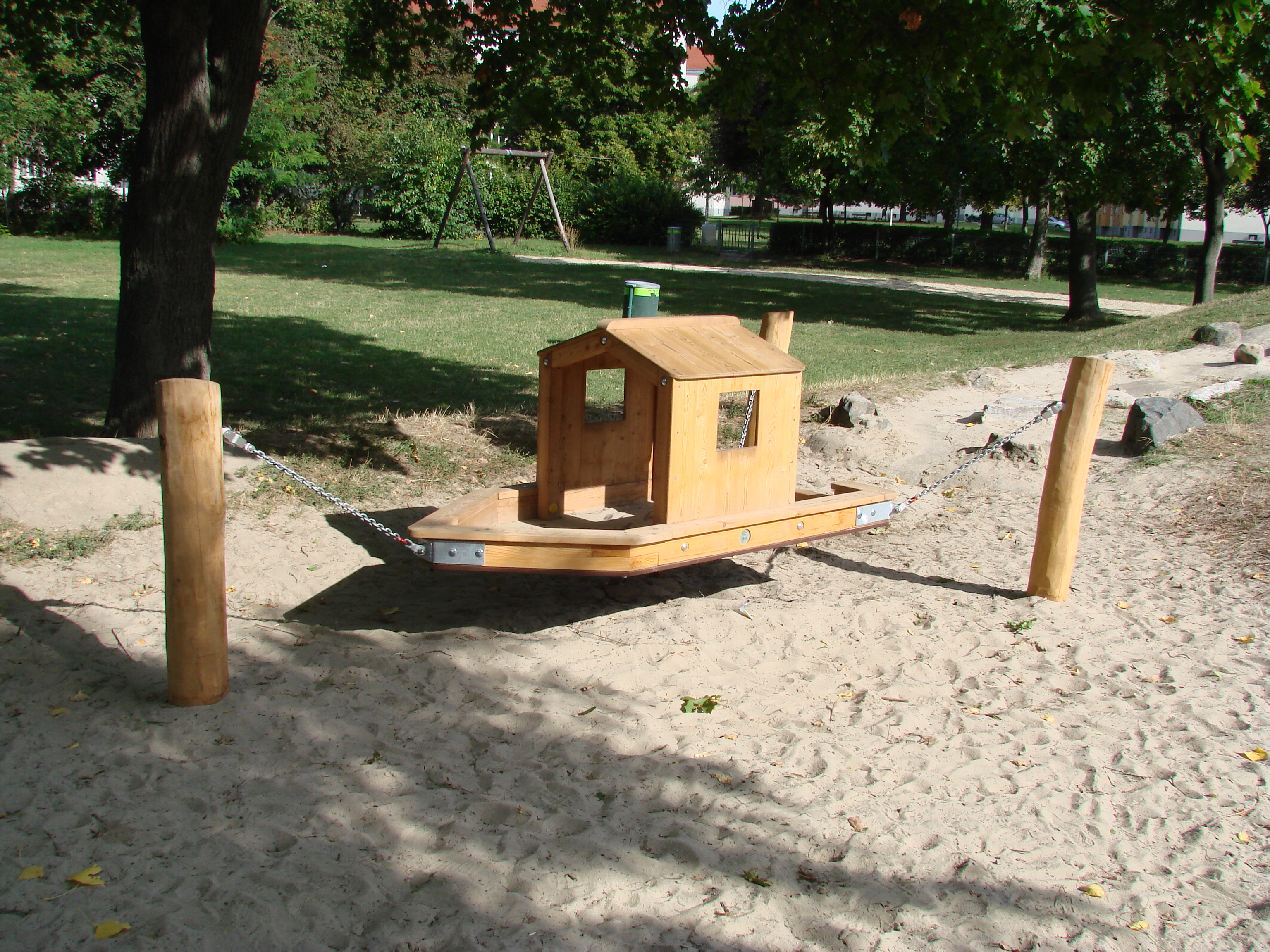 Das Hausboot besteht aus einer schwebenden Plattform, welche ein Bootsdeck darstellt. Auf dieser Plattform ist ein Häuschen aufgebaut. Das Hausboot ist mit feuerverzinkten Ketten an massiven Pollern abgehängt. Dadurch schwankt das Boot beim Bespielen so, als würde es auf einem Gewässer treiben, allerdings ohne zu kippen.