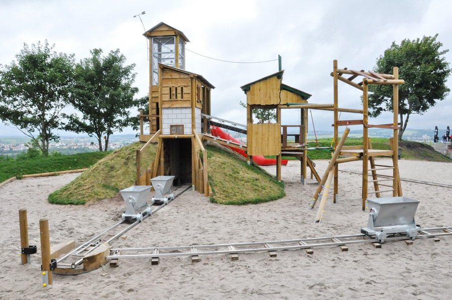 Beschreibung: 23 Steher (Pfosten) aus Rundhölzern Ø 12 cm, 9 MAXIMO Viereck- Podeste, 2 Stk. davon mit Durchstieg, 3 MAXIMO Dreieck-Podeste, 1 Fixbrücke schräg, tragende Konstruktion und Verkleidung aus Stahl, feuerverzinkt, 1 Leiter, 1 Stangen-Kletteraufstieg, 1 Wackelteller-Brücke, 1 Bergsteiger-Kletterwand schräg, 1 Herkules-Netztrichter, 2 Herkules-Netzpodeste ca. 100x50 cm, feinmaschig, 9 Stollenwände aus 3-Schichtplatte 20 mm mit Aussteifungskreuzen, 1 Abtrennwand im Stollen aus 3-Schichtplatte 20 mm, ca. 17 m² Kellermatte, 1 Stollenportal mit seitlichen Stützwänden aus 3 Schichplatte 20 mm und Pollern, 2 Sandförderbänder, 1 Sandtransport, 1 Sandtrichter mit Sieb, 2 Sitzbänke, 2 Pultdächer aus 3-Schichtplatte mit Intaglio-Fräsungen, 1 Pultdach sowie 1 Giebeldach mit Wellblech-Eindeckung, Verkleidungen teilweise aus 3-Schichtplatte mit Intaglio-Fräsungen, teilweise mit 3-Schichplatten mit aufgeschraubten sägerauen Brettern, gerollt, teilweise mit 8 mm HPL-Platte mit Intagio-Fräsungen, Turm im oberen Teil mit Stahl-Fachwerk und feinmaschigem Stahlgitter verkleidet, diverse Designelemente und Farbakzente, 1 Zahnrad-Paneel.