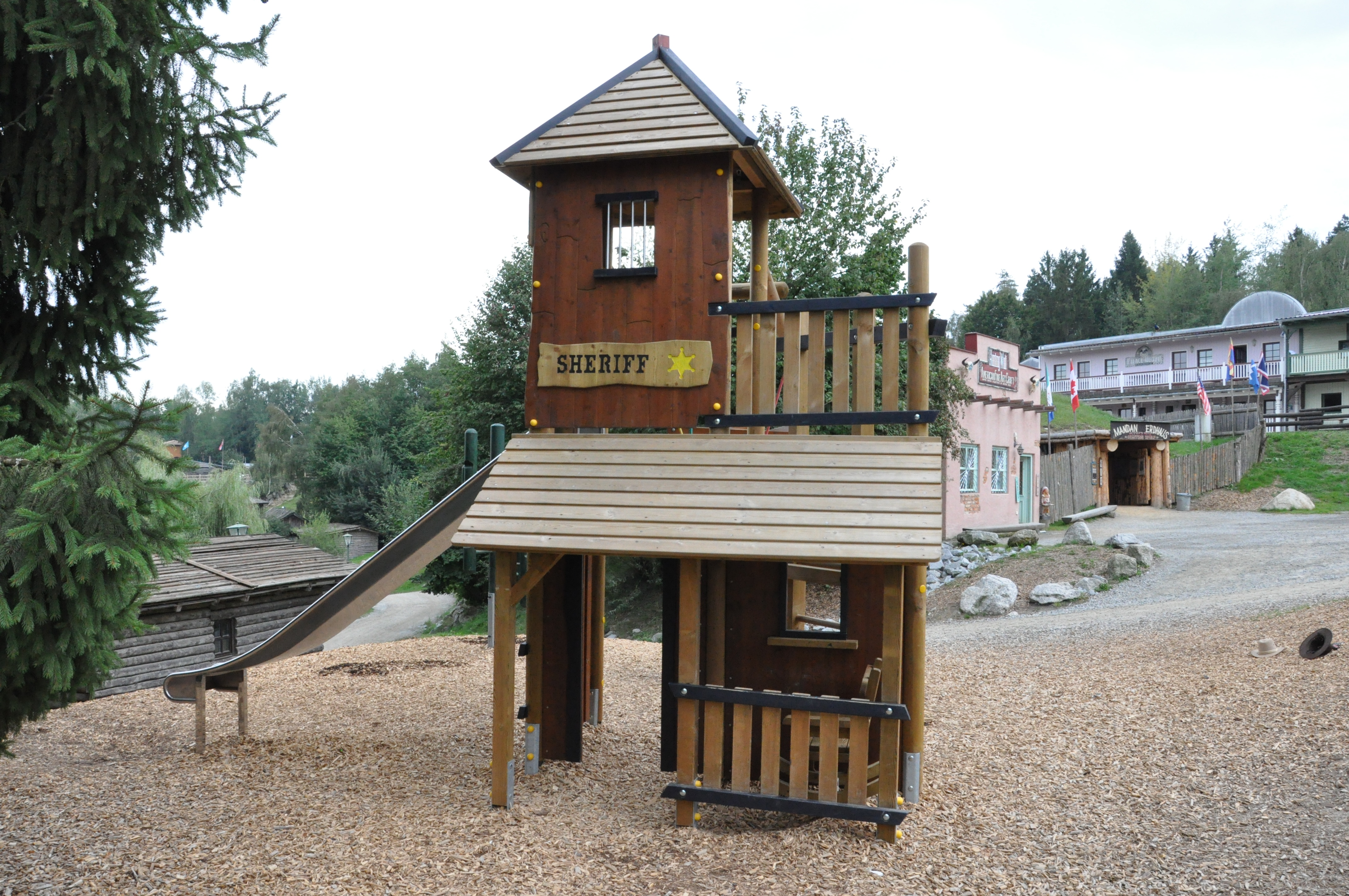 Beschreibung: Die Westernkombination „Sheriff / Jail“ besteht aus 2 Klettertürmen, wobei 1 Turm als Gefängnis, der andere als Sheriff-Posten verkleidet sind. Die Türme sind über eine Brücke verbunden. Ein Turm bietet die Möglichkeit zum Anbau einer Rutsche.