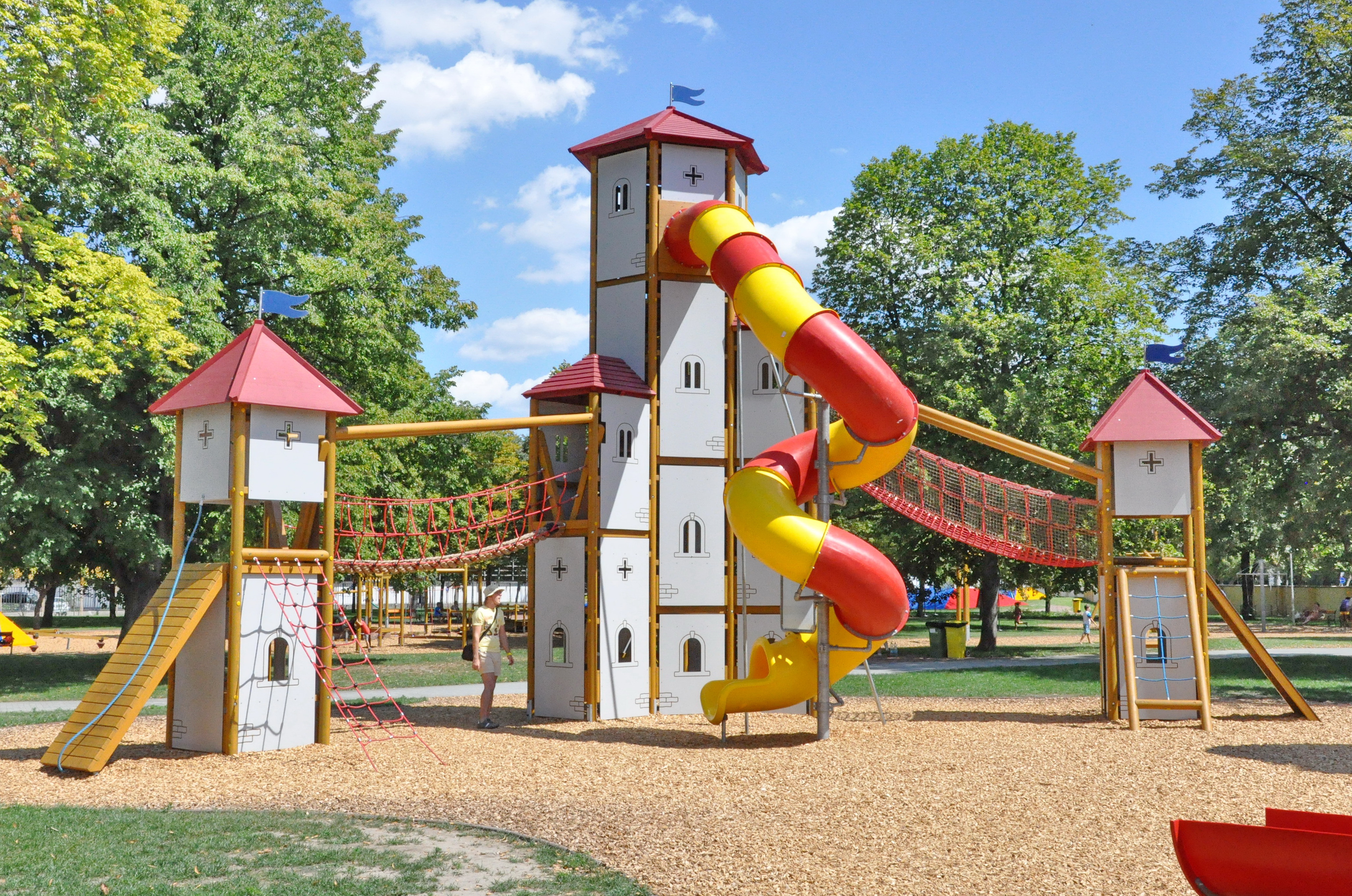 Beschreibung: 1 Sechseckturm mit Zeltdach, rot, Podesthöhe maximal 6,0 m, 3 Anbautürme mit Walmdächer, rot, 2 Vierecktürme mit Zeltdächer, rot, 7 Aufstiege, 1 Rutschstange, 1 Netzbrücke, V-förmig, 1 Netztunnel, Burgwand-Ver- kleidungen aus HPL-Platten. Aufständerung mit 21 Stk. Doppellaschen, 11 Stk. Eisenschuhe für Aufstiege.