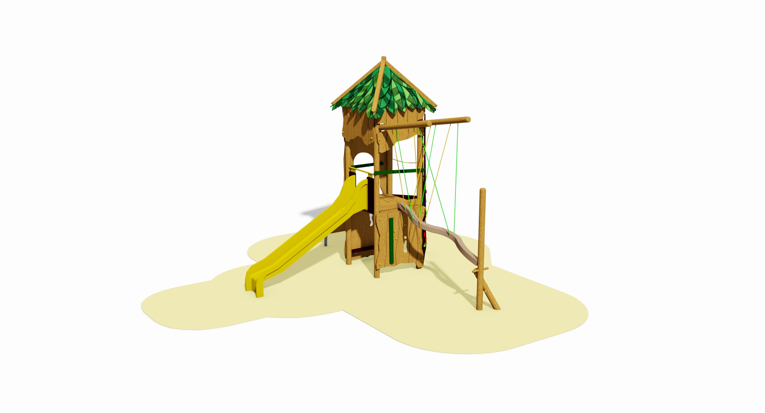 Beschreibung: 5 Steher (Pfosten), Ø 12 cm, 1 Steher Ø 14 cm, 1 Maximo-Viereckpodest, 1 Podest-Erweiterung aus Siebdruckplatte, 3eckig, 2 Handläufe aus Kanthölzern (KH) 4/7 cm, 1 Herkules-Seilhandlauf, 1 Absturzsicherung für Rutschen, 1 Bergsteiger- Kletterwand mit organischer Außenkontur, 1 Helix-Sprossenwand, 1 Kantgeflecht- Balanciertau 12/12 cm, mit 6 Herkules-Tauen an 2 auskragenden Balken abgehängt, 1 Bogen-Aufstieg aus 2 gebogenen Formrohren mit aufgeschraubten KH 3/9 cm und färbigen Kletterhilfen aus Halbhölzern, 1 Zeltdach im Urwalddesign, Dachflächen aus HPL-Platte mit aufkaschierter Folie im Urwalddesign bedruckt, mit Schutzlaminat versehen, 6 Brüstungen bzw. Wandverkleidungen aus Dreischichtplatte mit Intaglio- Fräsungen, 2 Wände mit Spielfunktionen (Zahnräder und Sitzbank).