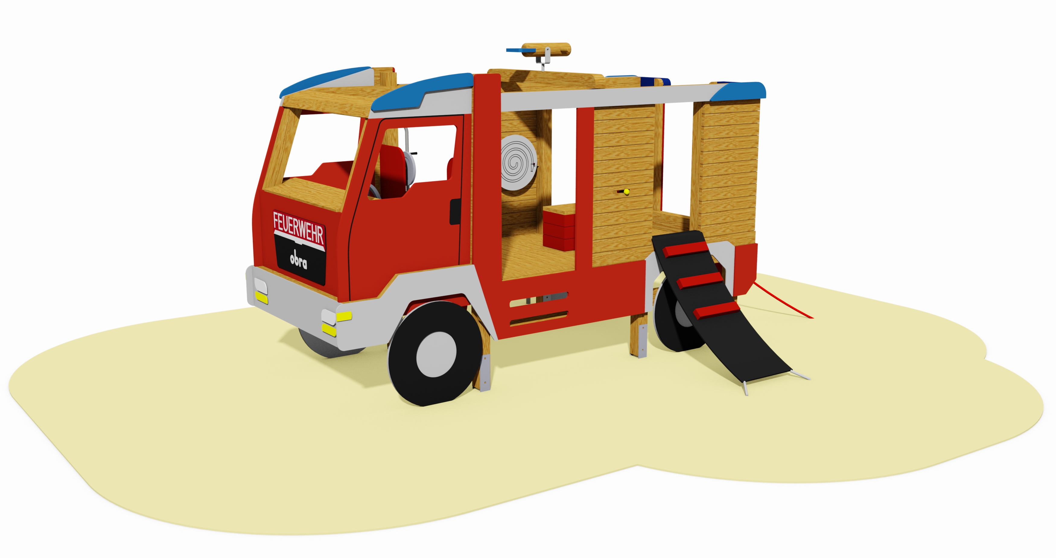 Beschreibung: Das Löschfahrzeug ist ein Rollenspielgerät mit großzügigem Spielangebot. Es enthält neben dem für Fahrzeuge unentbehrlichen Lenkrad auch eine Gangschaltung, ein Funkgerät, ein Absperrventil mit Drehrad, eine Drehscheibe Schlauchrolle, Drehknöpfe, einen Schalter und einen Hebel, so- wie eine Löschspritze. Konstruktion aus 6 Steher (Pfosten) aus Kantholz (KH) 9/9 cm, 4 Unterzüge aus KH 9/11 cm, 2 obere Rahmenhölzer sowie 4 vordere Rahmenhölzer und 1 senkrechtes Rahmenholz aus KH 9/9 cm, 3 senkrechte Rahmenhölzer aus KH 4/7 cm, Verkleidungen aus HDPE—Platte 19 mm und HPL-Platte 8 mm, 1 Lenkrad drehbar, 2 Sitzbänke, 1 Schiebeelement „Gangschaltung“, 1 Doppel- Schwingtür aus Gummigurt, 2 Haltegriffe in NIRO, 2 Drehknöpfe, 1 Schiebe- element „0 / 1“, 1 Kiste aus KH, 1 Leiter, 1 Feuerwehr-Kletterstange, 1 Netz- Einstieg, 1 Gummiband-Aufstieg.