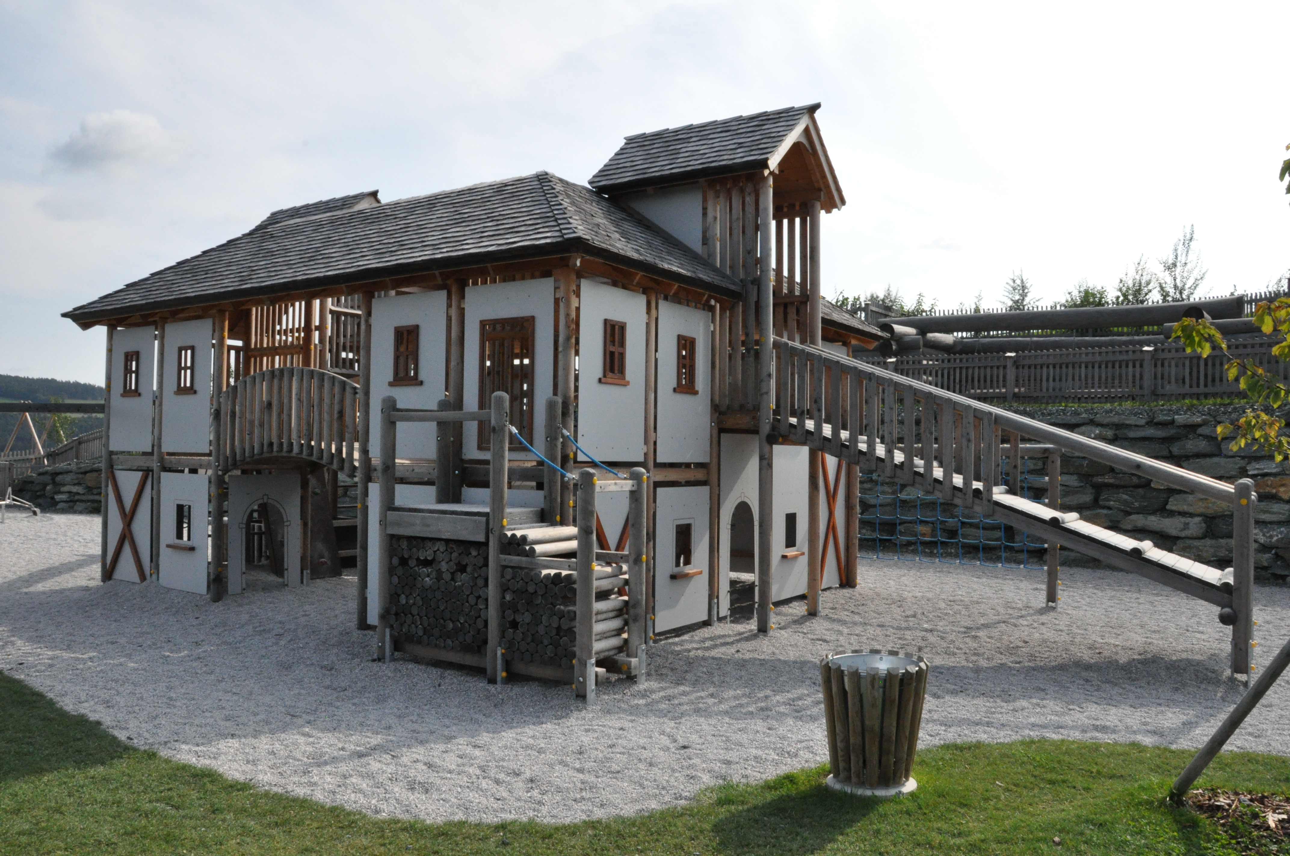 Beschreibung: Der Bauernhof entspricht in der Form einem Vierkanter. Außen- und innenliegende Spielelemente ermöglichen zahlreiche Kletter-Aktivitäten, außen wurde ein Aufzug für Transportzwecke, hauptsächlich Sand- und Hackschnitzel, angeordnet. Der Bauernhof kann mit Zusatzelementen wie Wackeltraktor, Federtiere, Spielskulpturen, sowie anderen Transporteinrichtungen für Sand und Wasser ergänzt werden.