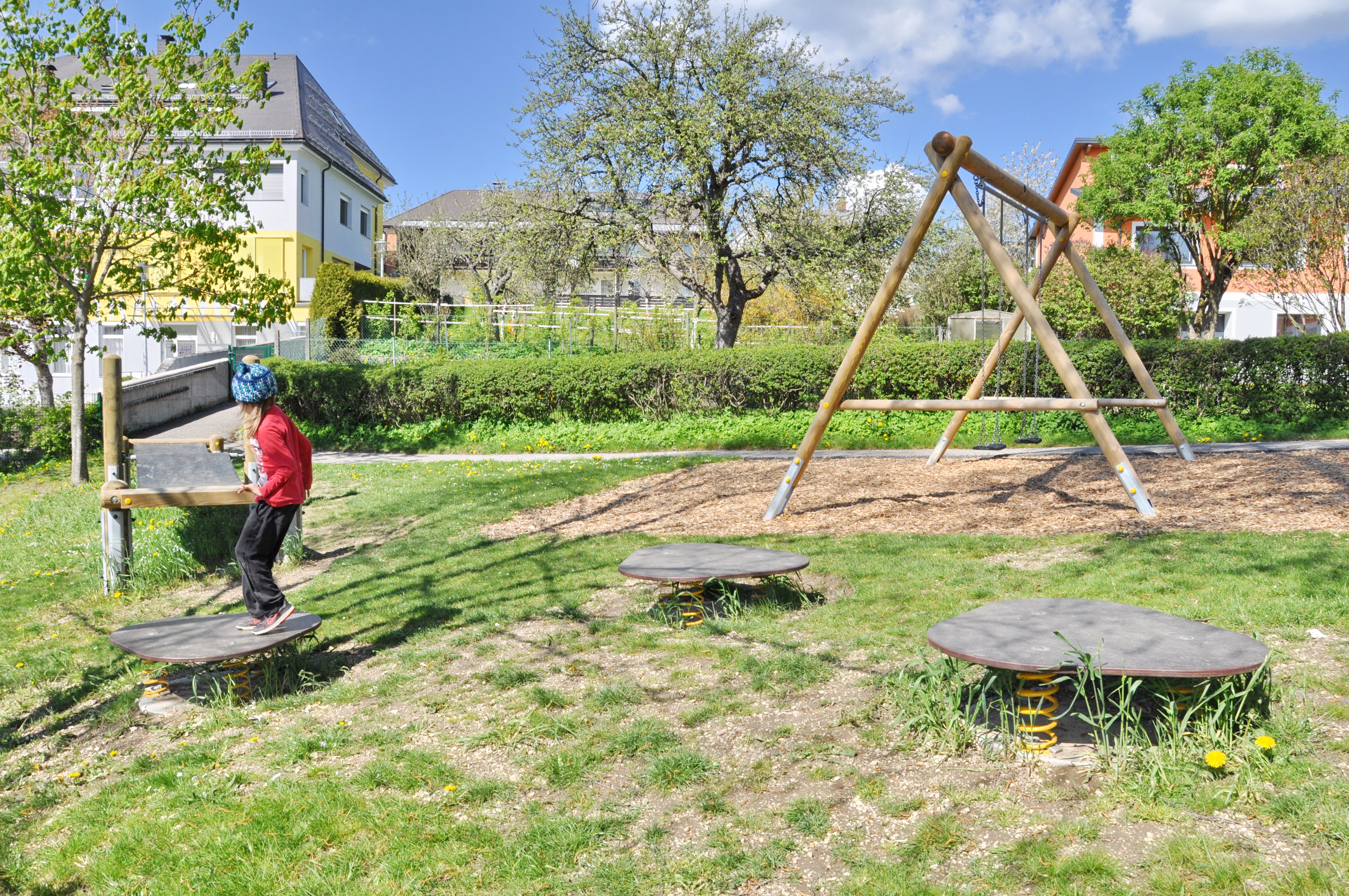 Das Spielgerät Hüpfplatteist geeignet für Kinder ab 4 Jahre.