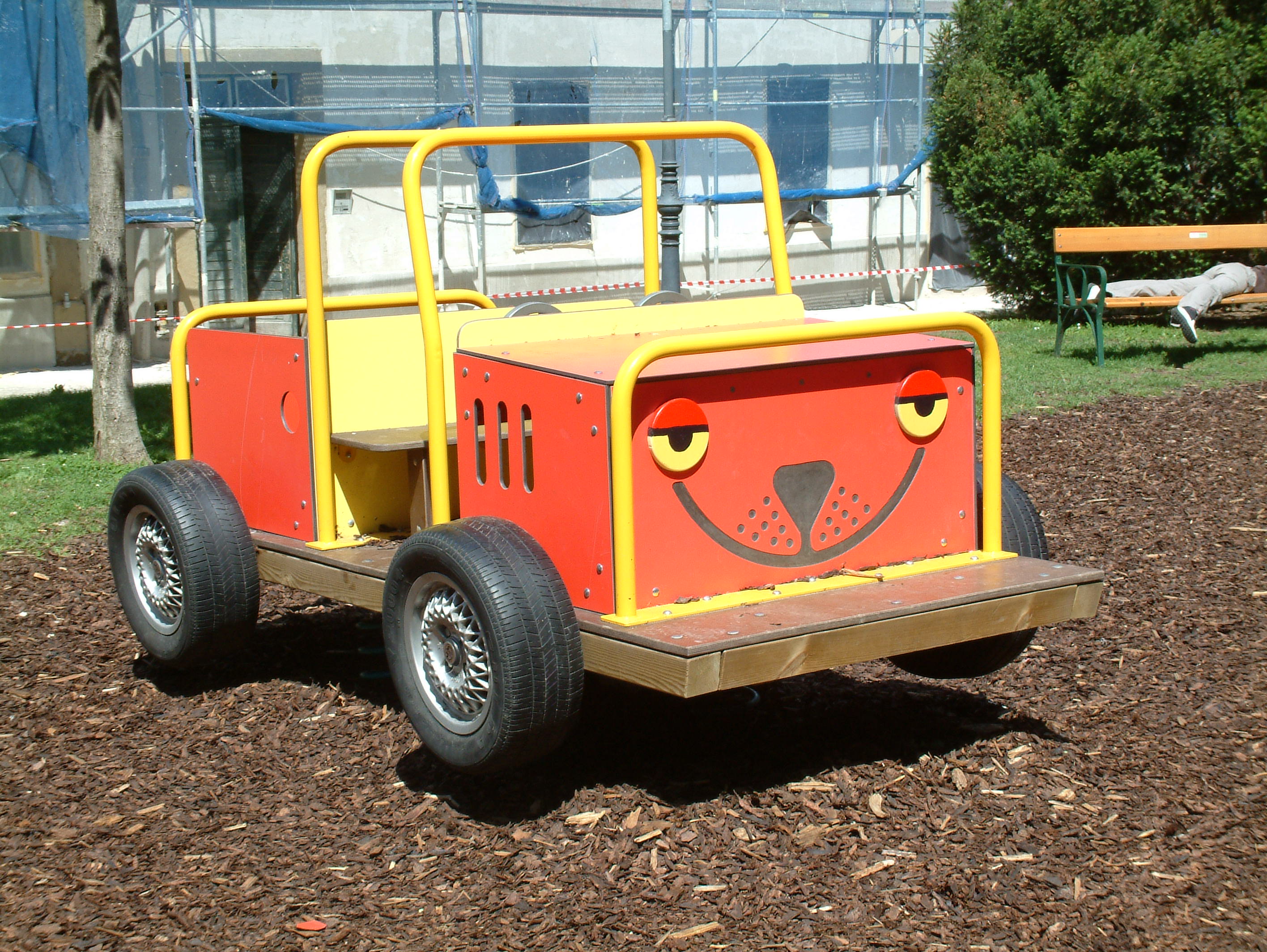 Beschreibung: Auf einer Plattform, mit darunterliegendem, stabilem Wippengelenk, Stoßdämpfung mit Spiralfedern, ist der Jeep aufgebaut. Boden, Motorhaube und Bordwände aus HPL-Kunststoffplatten, 10 mm stark, Sitzbänke aus Siebdruckplatten, Halte- und Überrollbügel aus Edelstahlrohren, 2 Lenkräder, Armaturen, 4 glatte Reifen, auf Felgen montiert, ausgeschäumt. Der Wackeljeep wird komplett vormontiert geliefert.