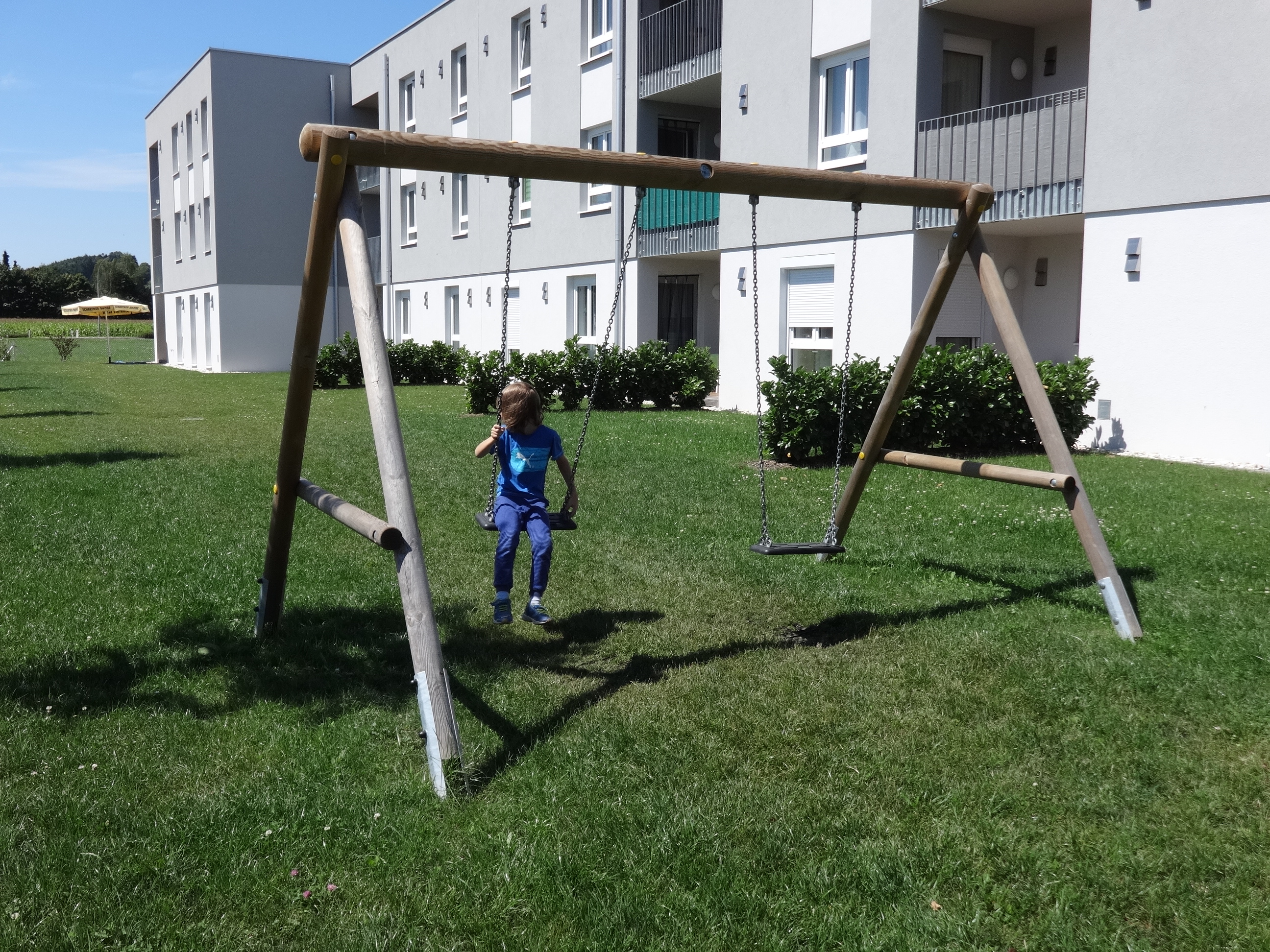 Die Zweifachschaukel besteht aus zwei massiven A-Stützen und einem 3,5 m langen Schaukel-balken. Der Schaukelbereich ist seitlich durch Durchlaufsicherungen zwischen den A-Stützen abgeschirmt.