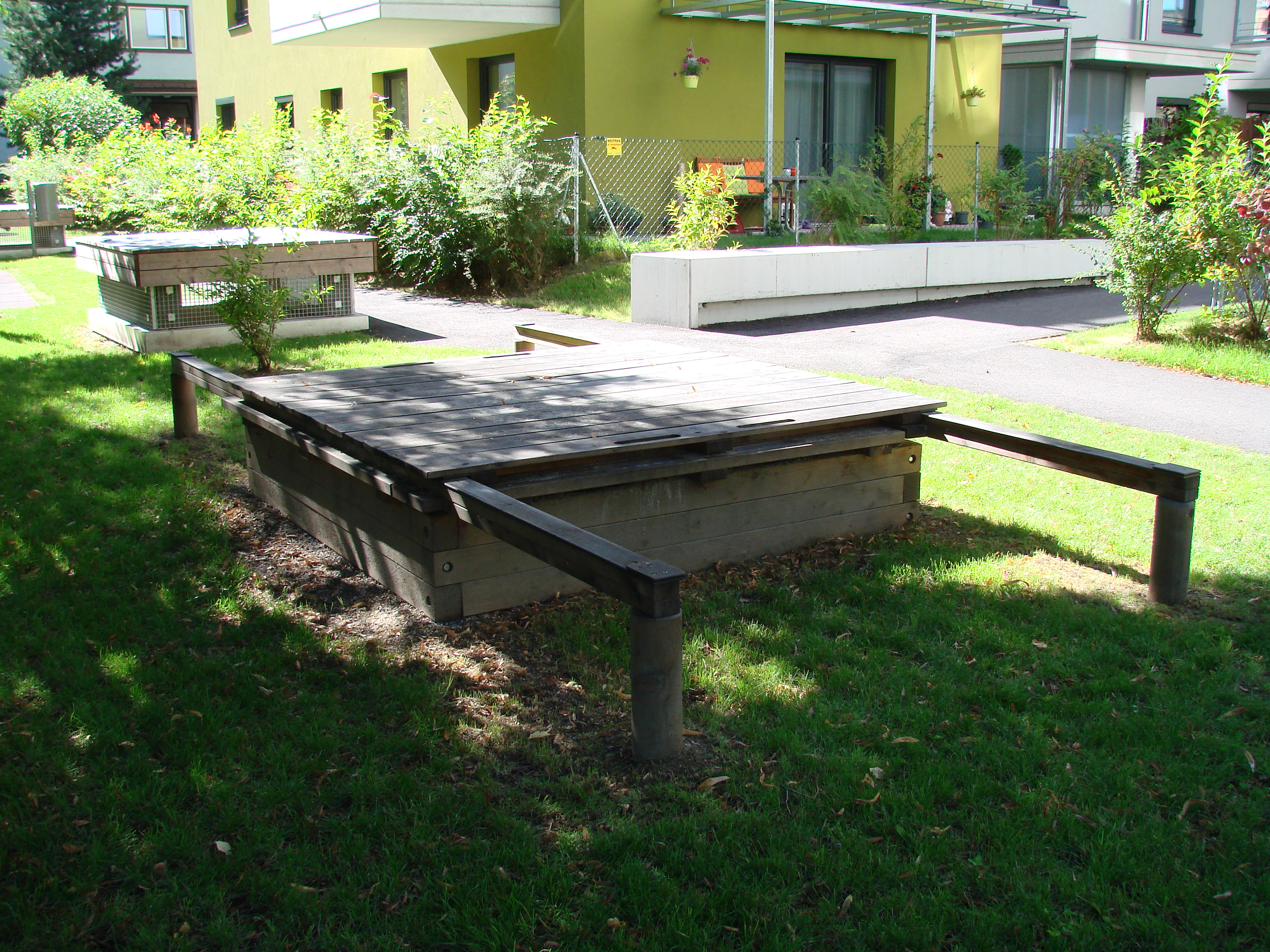 Beschreibung: 4 Stk. Steher (Pfosten), Rundhölzer Ø 12 cm, darauf befestigt Kanthölzer 4x7 cm mit HPL-Platten-Strei- fen, als Gleitfläche zum Schieben, Abdeckung aus Bretter 2,5/17 cm, mit Unterschraubhölzern zusammengebaut, zweiteilig, verschiebbar.