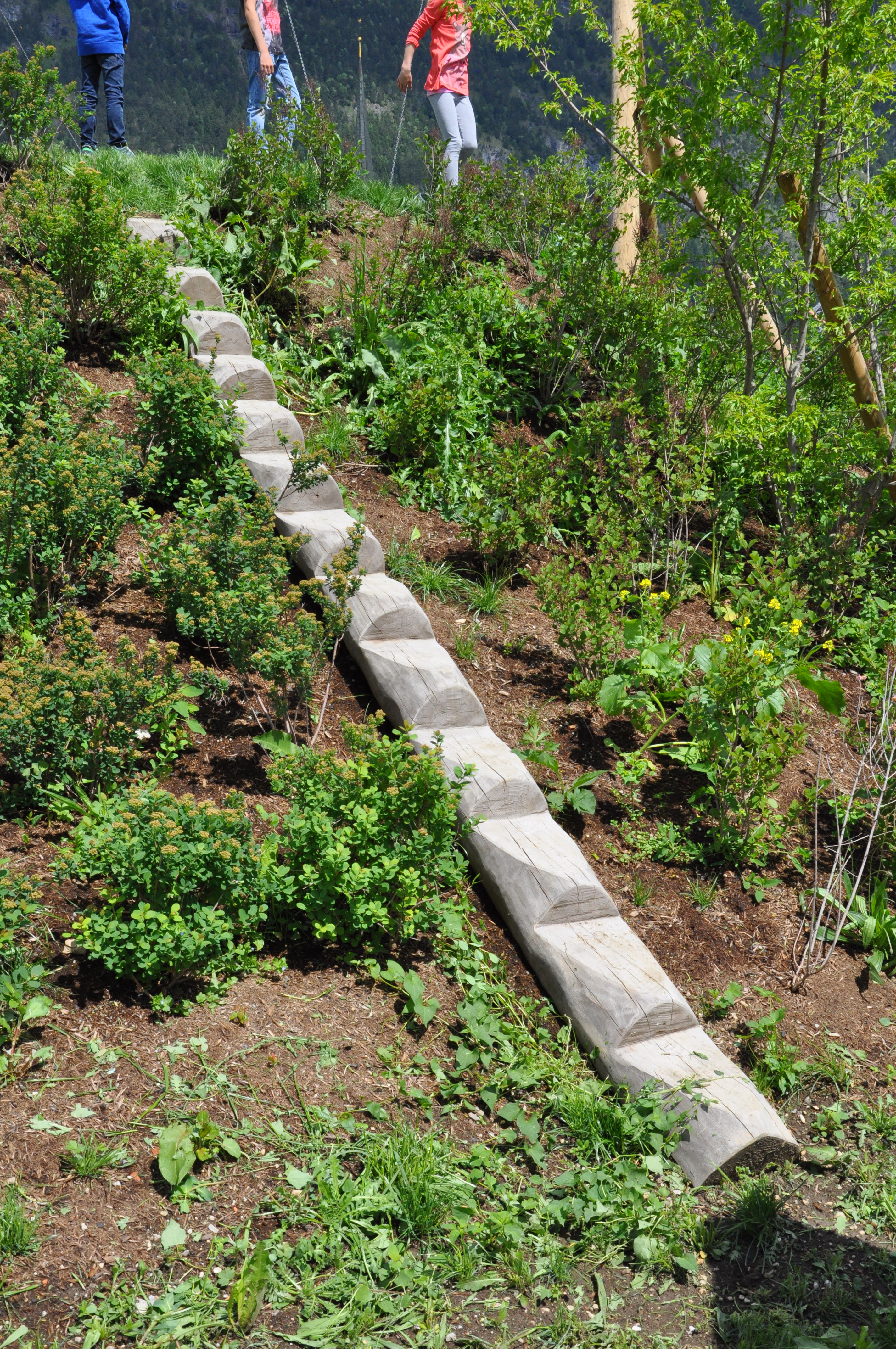 Beschreibung: 1 Robinienstamm, splintfrei, geschliffen, Ø ca. 20 cm, 4Stk. Pflöcke Ø8 cm, gespitzt. Die Steigkerben werden der Hangneigung entsprechend im Zuge der Montage eingeschnitten und verschliffen.
