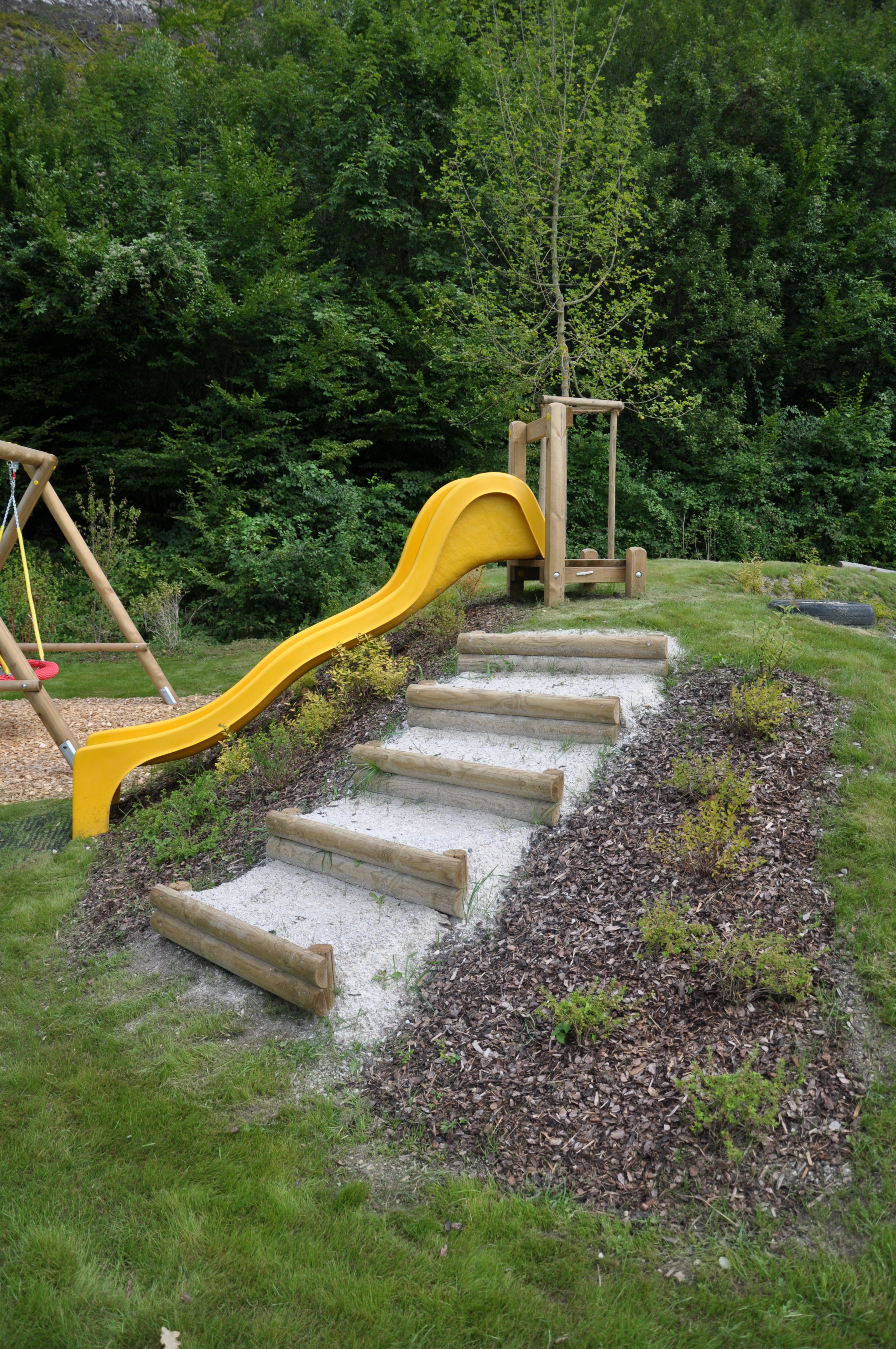 Die Stufen zum Hinterfüllen beinhalten Pflöcke, welche am Hang einzuschlagen sind, und Halbhölzer zum waagerechten Verschrauben an den Pflöcken. Für das Stufen-Füllmaterial soll geeigneter Kies verwendet werden, der sich verdichten lässt