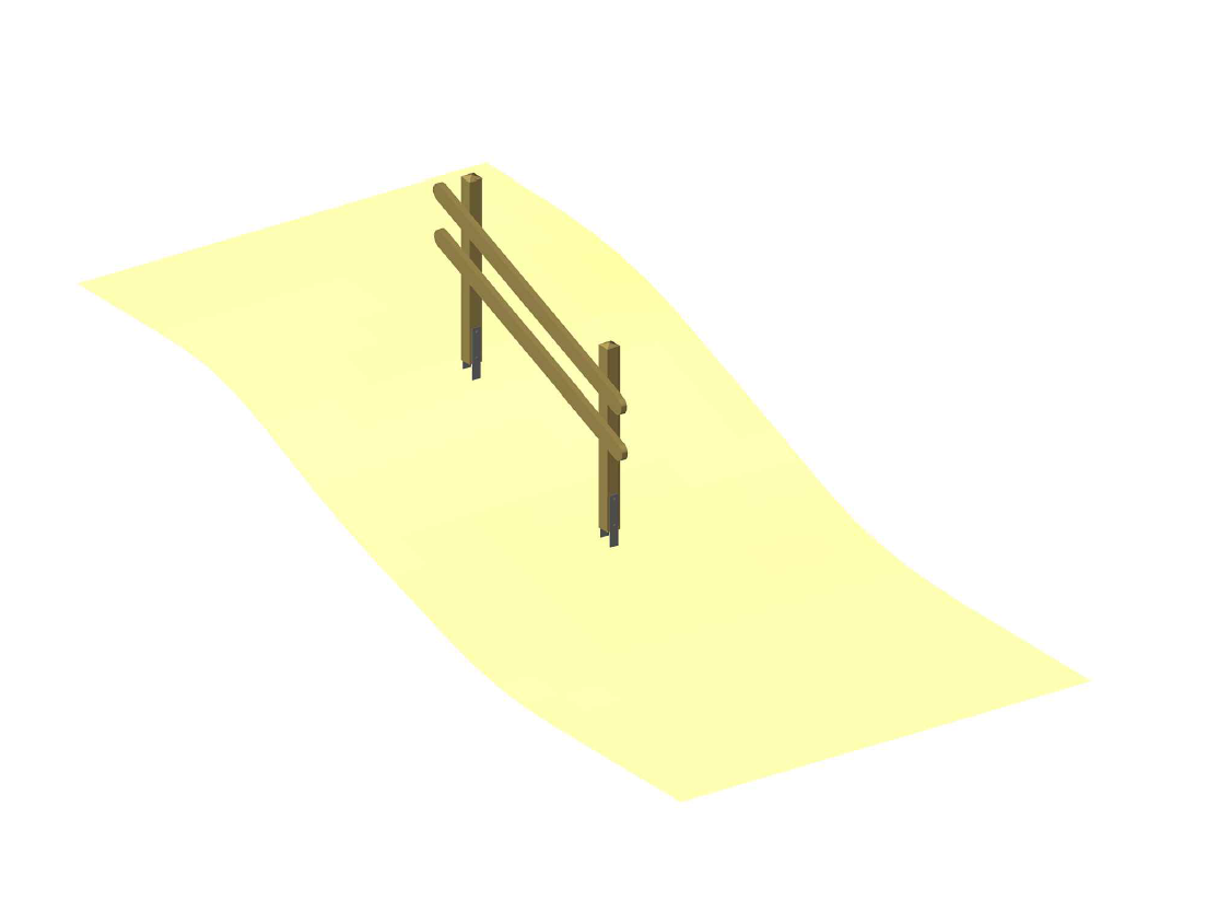 Beschreibung: An 2 Stehern (Pfosten), aus Kanthölzern 9/9 cm werden seitlich 2 Handläufe übereinander, Kanthölzer 4/11 cm, entsprechend dem Geländeverlauf verschraubt. Handläufe werden mit Polyamiddistanzen montiert um ein durchgehendes Halten zu ermöglichen.
