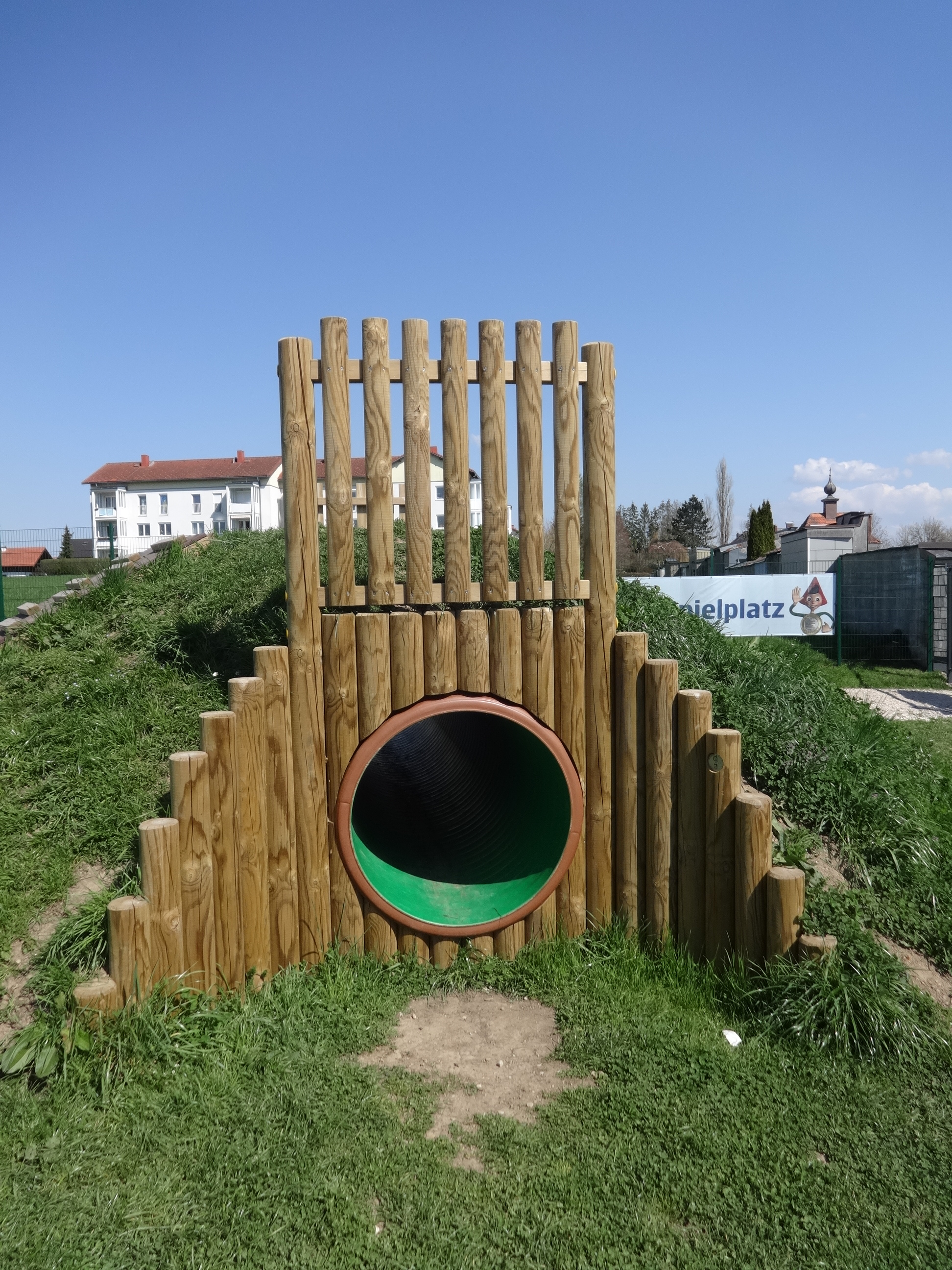 Das Spielgerät Palisaden-Portal für PP-Kriechtunnelist geeignet für Kinder ab 3 Jahre.