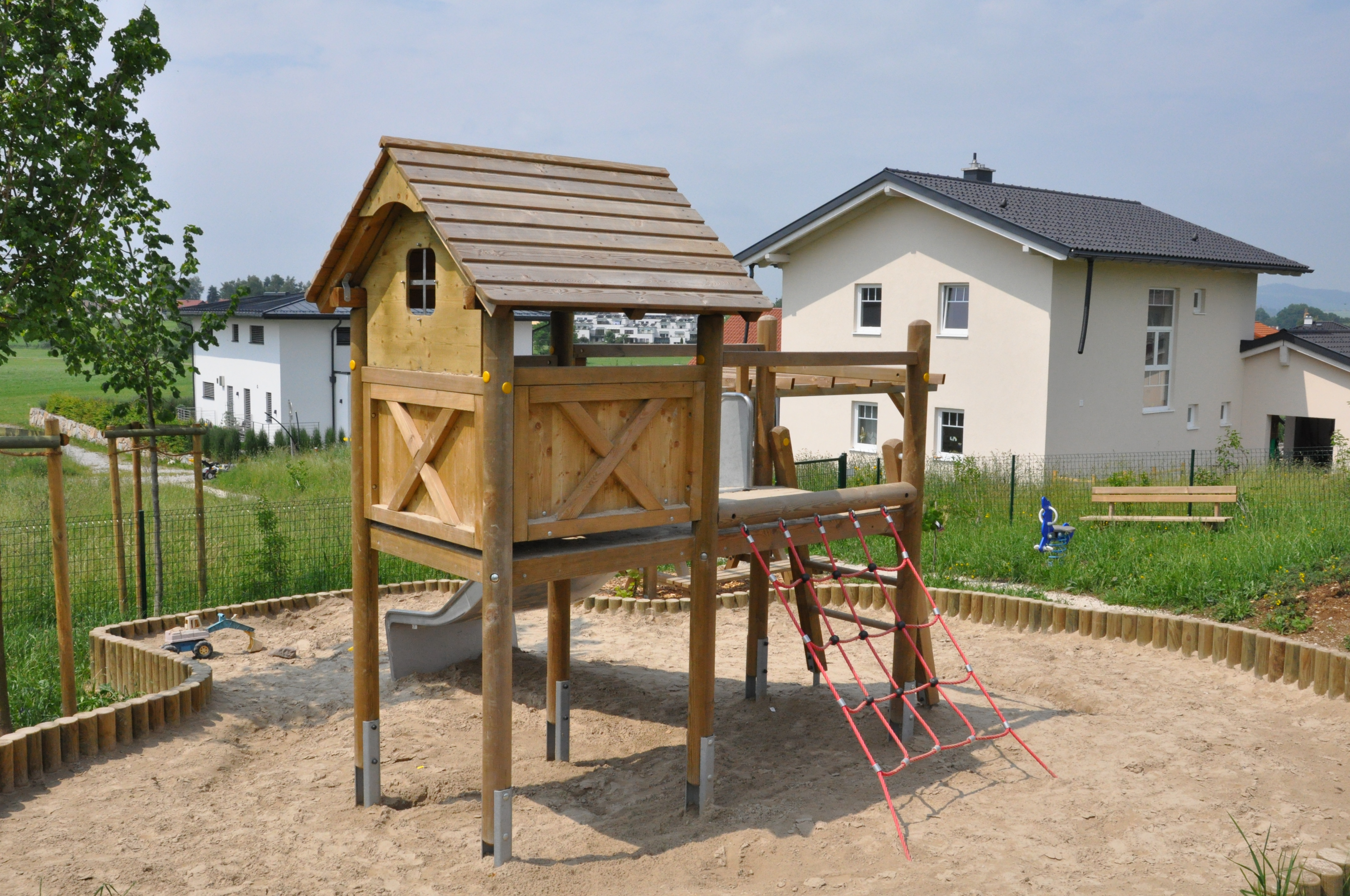 Beschreibung: 8 Rundsteher (-pfosten) Ø 12 cm, 3 MAXIMO Podeste, 1 schräge Leiter, 1 Netzaufstieg über 2 Podeste, 3 Brüstungselemente, 5 Handläufe, 1 Giebeldach, 1 Tisch, 2 Bänke aus Siebdruckplatte