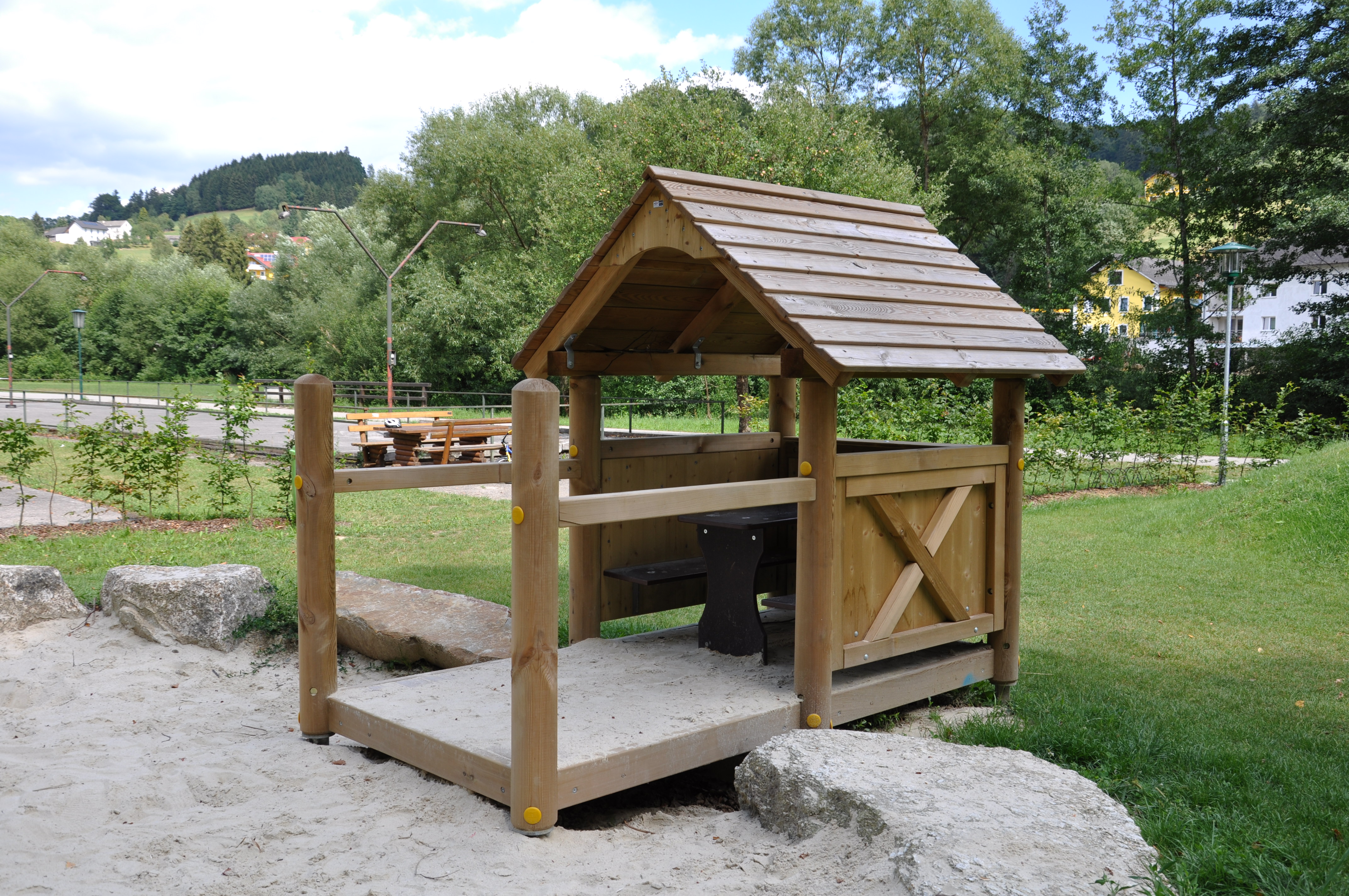 Das Spielhaus besteht aus zwei quadratischen Podesten auf sechs Stehern mit einem Dach. Drei Seiten sind mit Brüstungselementen versehen, über die vierte Seite kann man das Spielhaus betreten. Im Inneren befinden sich 2 Bänke und 1 Tisch. Das vorgelagerte Podest dient als Veranda und ist beidseitig mit Handläufen versehen. So ist das Puppenspielhaus mit Veranda ein ideales Gerät für Kleinkinder um Rollenspiele zu spielen und soziale Kontakte zu erlernen.