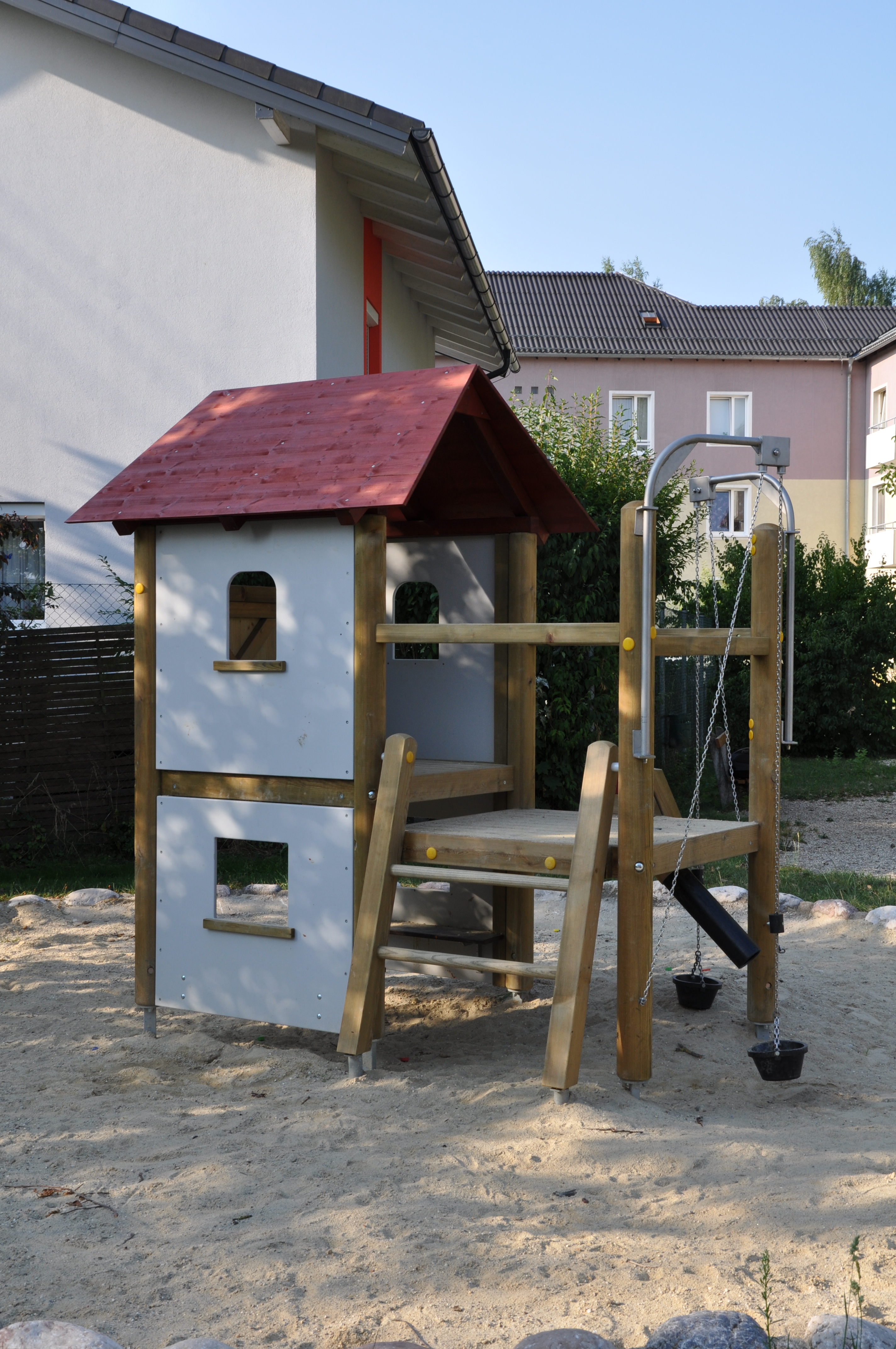 Beschreibung: 6 Steher (Pfosten) Ø 12 cm, 2 MAXIMO- Viereckpodeste aus Kanthölzer 4/11 cm und 3,5/10 cm, genutet, mit Stahl-Unterkonstruktion verschraubt, 1 Aufstiegsleiter schräg, aus Kanthölzern 9/9 cm, mit Ø 45 mm Hartholzsprossen, 2 Sandkräne schwenkbar, aus Edelstahl, Sandbehälter aus Gummi, 1 Sandrohr, 1 Sandschütte fix, 1 Giebeldach aus 3-Schichtplatte 20 mm, rot getaucht, Unterkonstruktion aus Kantholz 9/9 cm und 7/7 cm, 2 Wände oben, 2 Spielwände mit Sitzbank unten, alle grau lasiert