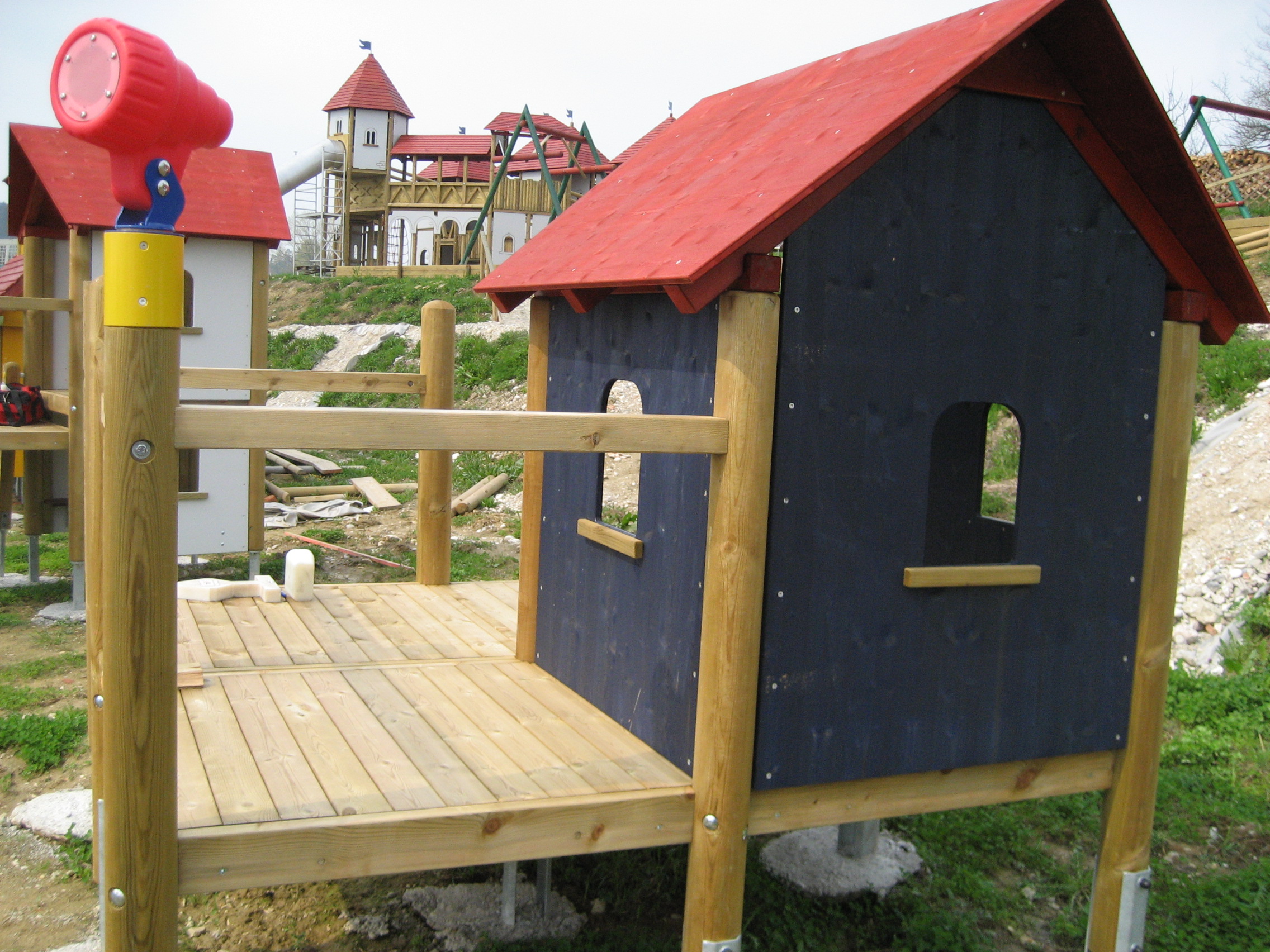 Beschreibung: 9 Steher (Pfosten) Ø 12 cm, 4 MAXIMO-Viereckpodeste aus Kanthölzer 4/11 cm und 3,5/10 cm, genutet, mit Stahl-Unterkonstruktion verschraubt, 1 Treppe, Seitenwangen und Trittstufen aus Kantholz 4/23 cm, 1 Spiegel beweglich, aus Edelstahl, 1 Fernrohr (Kaleidoskop) beweglich, 1 Giebeldach, 3 Brüstungswände aus 3-Schichtplatte 20 mm, blau getaucht, 2 Sitzbänke aus Siebdruckplatte 20 mm.