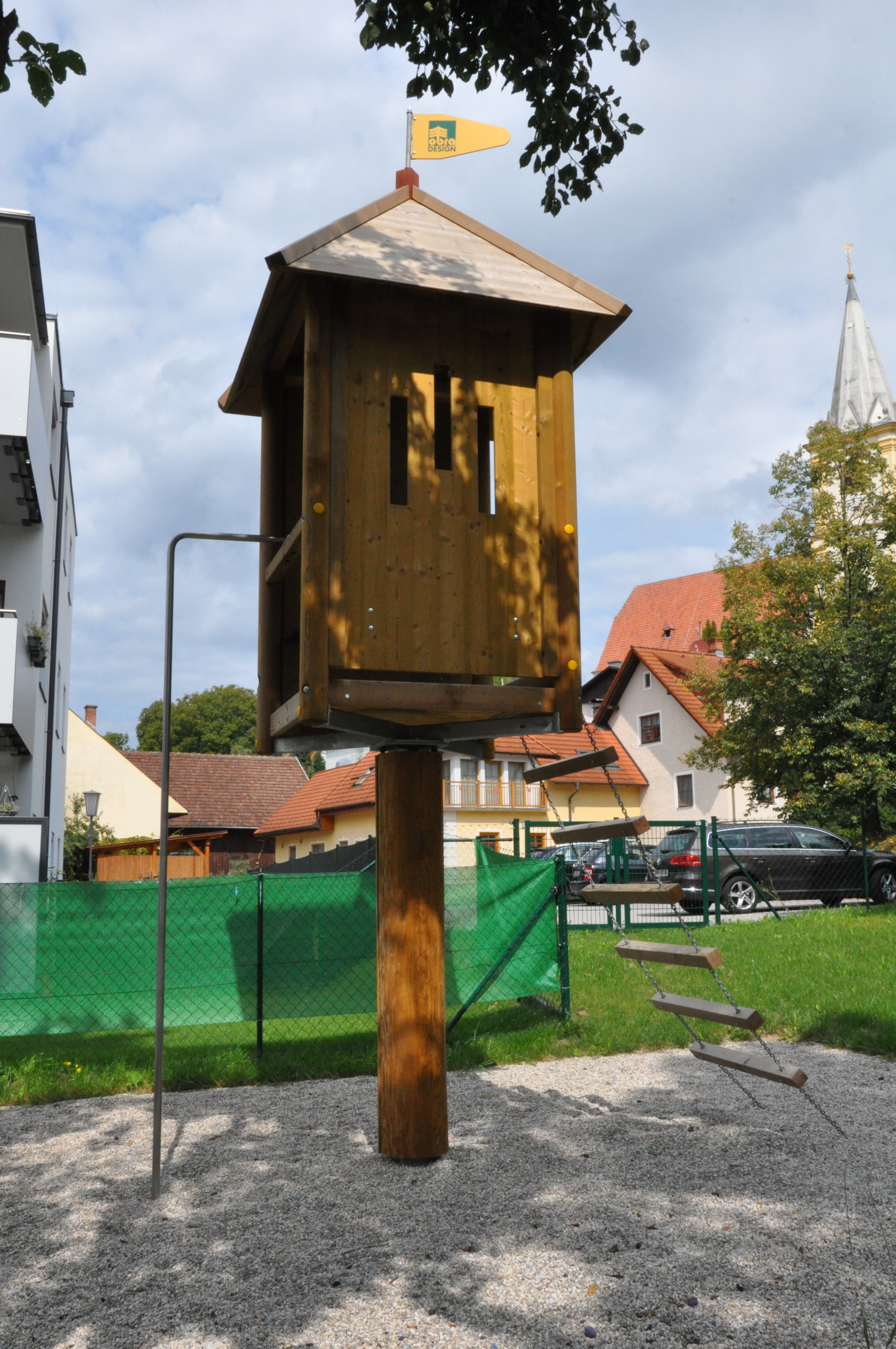 Beschreibung: Das Baumhäuschen wird über 1 Stk. Stahl-Formrohr-Steher aufgebaut. Der Formrohrsteher wird mit 4 Stk. gerundeten Schwarten verkleidet. Das Baumhäuschen besteht aus 4 Rundsteher Ø 12 cm, 1 Turmpodest, 2 Seitenwänden und 1 Zeltdach. Der Aufstieg erfolgt über 1 Balken-Ketten-Aufstieg und 1 Feuerwehr- Kletterstange.