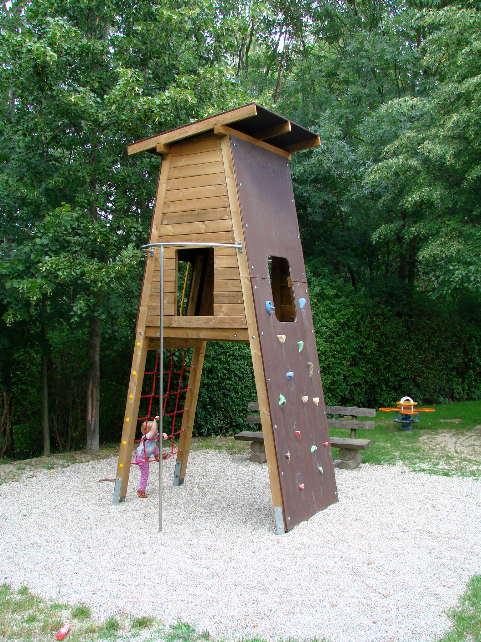 Beschreibung: Konstruktion aus Kanthölzern 11/11 cm, Boden aus Kanthölzern 4/11 cm, Podestunterzüge 9/11 cm, Pfetten 9/9 cm, Sparren 7/13 cm, Dach aus Siebdruckplatte, Wandverkleidung aus Kantholz 3/12 cm und Siebdruckplatte, 1 Bergsteiger-Kletterwand mit Klettergriffen, 1 Netzaufstieg, 1 U-Kletterstange, Edelstahl.