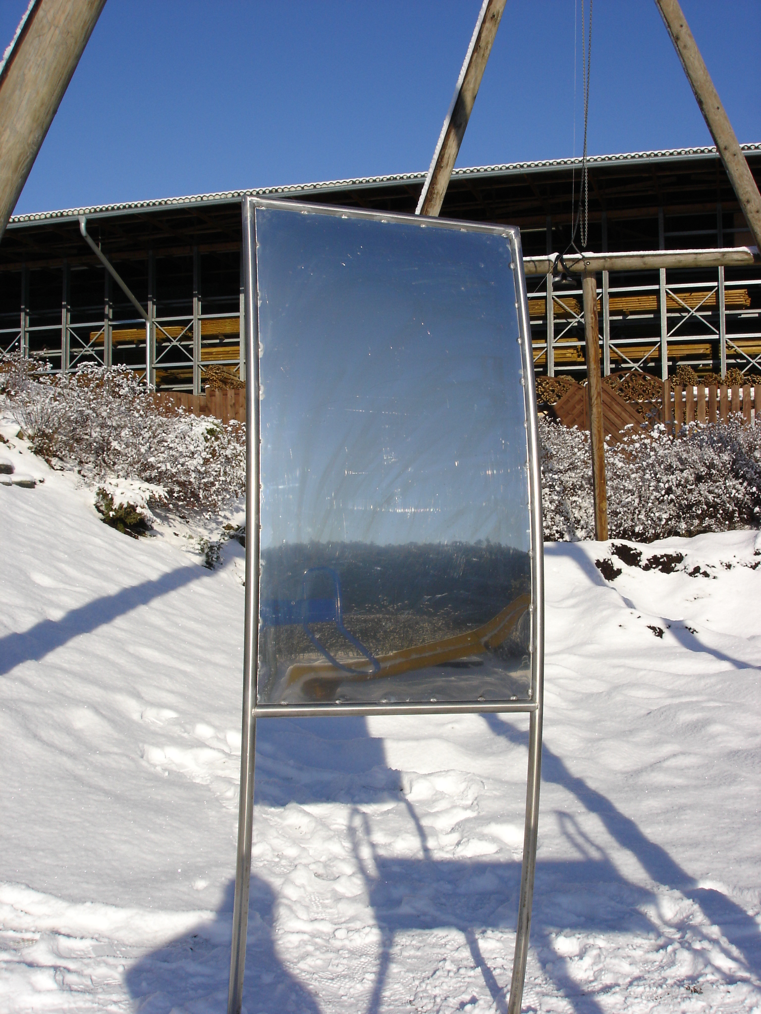 Beschreibung: Stahlrohrrahmen Ø ca. 35 mm, Edelstahlblech mit Rundrohrrahmen verschweißt, eine Seite konkav, andere Seite konvex. Durch die Biegung der Spiegelfläche werden Zwergen zu Riesen und Riesen zu Zwergen.
