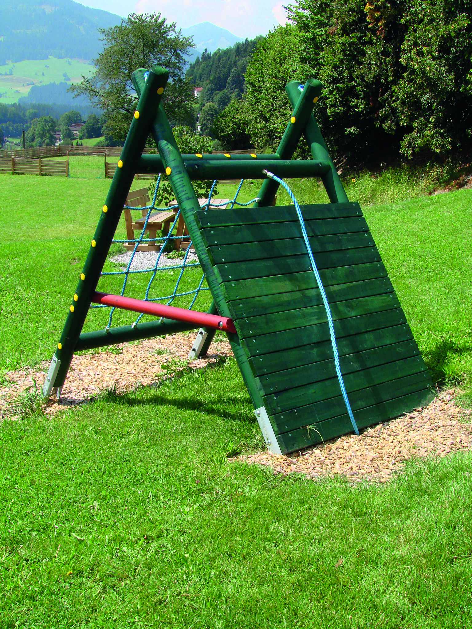 Beschreibung Klettergerüst: 1 Netzteil aus 2 Längs- und 2 Querholmen, 1 Herkules- Kletternetz, 1 Schiefe Ebene aus 2 Längs- und 1 Querholm(en), Belag aus Kanthölzern 4/11 cm, 1 Herkules-Hangeltau, an beiden Enden befestigt, 2 Durchlaufsicherungen Ø 8 cm, alle Knotenpunkte besitzen form- und kraftschlüssige Holzverbindungen.