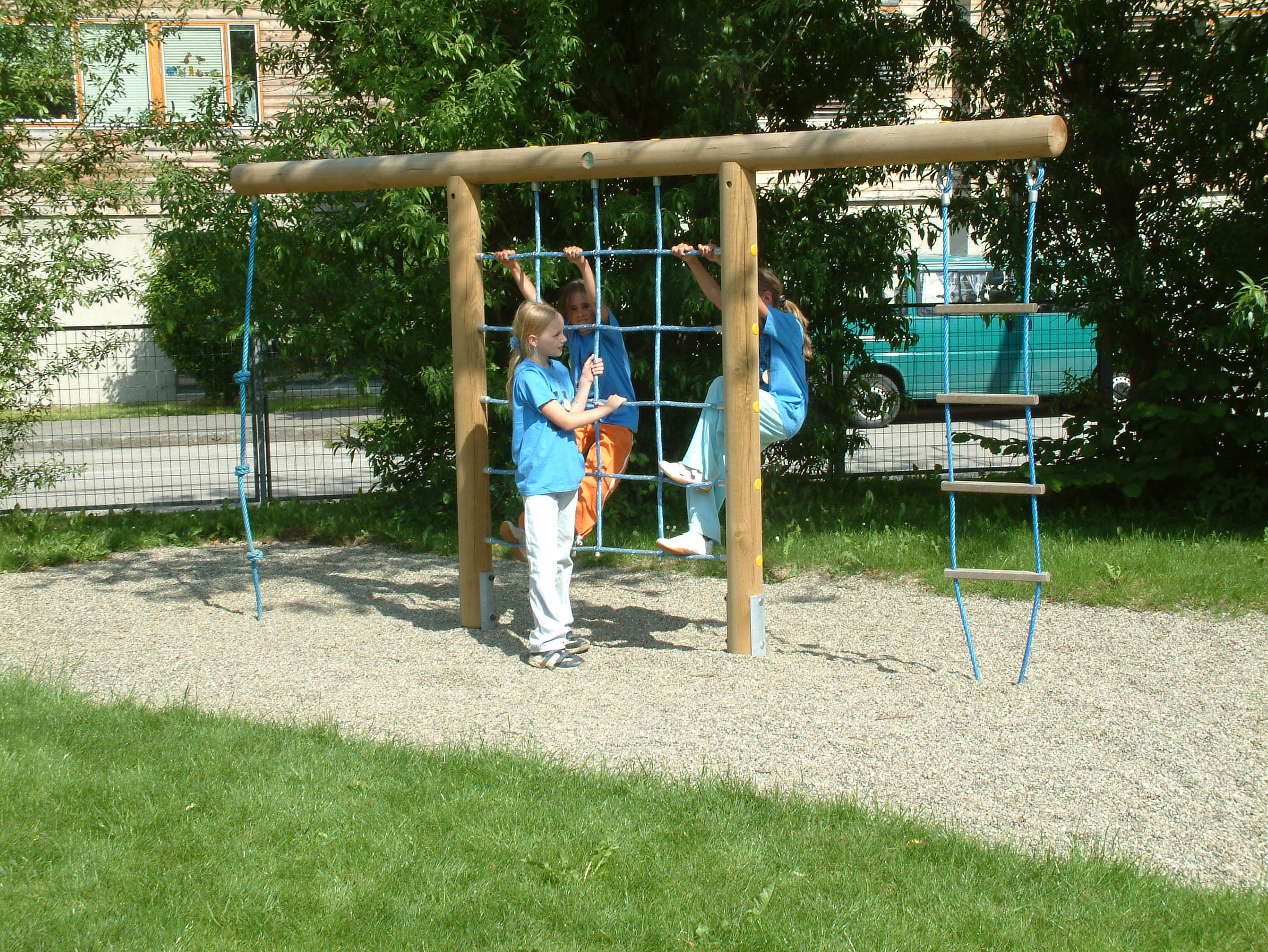 Kletterwand: 2 Steher (Pfosten), 1 aufgesetzter Querbalken, jeweils aus Rundhölzern Ø 14 cm, 1 Herkules-Kletternetz, 1 Strickleiter, 1 Knotentau, jeweils mit Bodenanker.