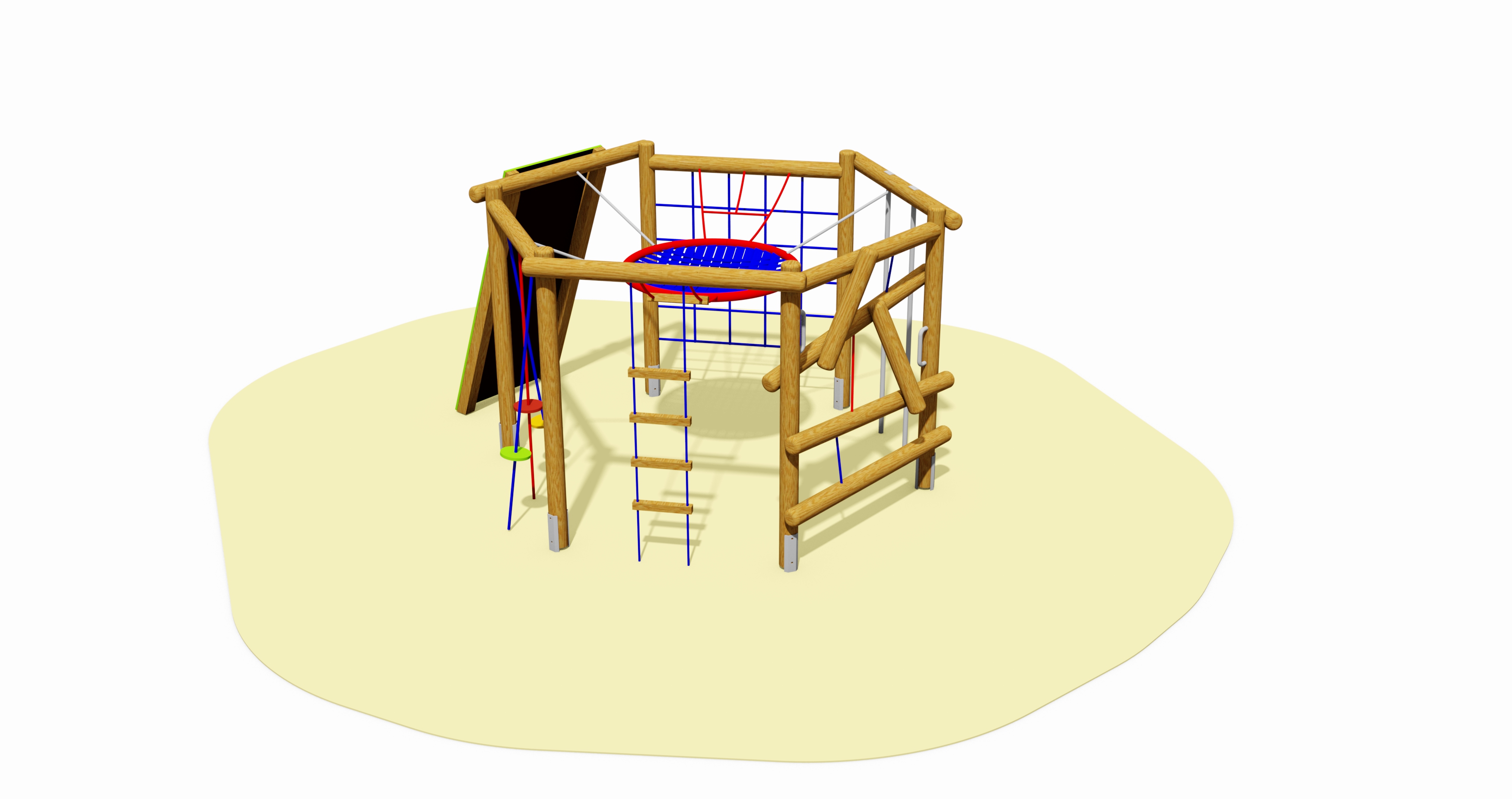6 Steher (Pfosten), 1 Kletterelement aus Rundhölzern, 1 Bergsteigerkletterwand schräg, 3 Klettertaue mit Discs Ø 20 cm in HDPE, an Herkulestauen abgehängt, 1 Kletternetz senkrecht, 2 Kletterstangen in Edelstahl, 1 Strickleiter, 1 Chill-Korb an Netzen und Ketten abgehängt. Aufständerung mit 6 Stk. Doppellaschen.