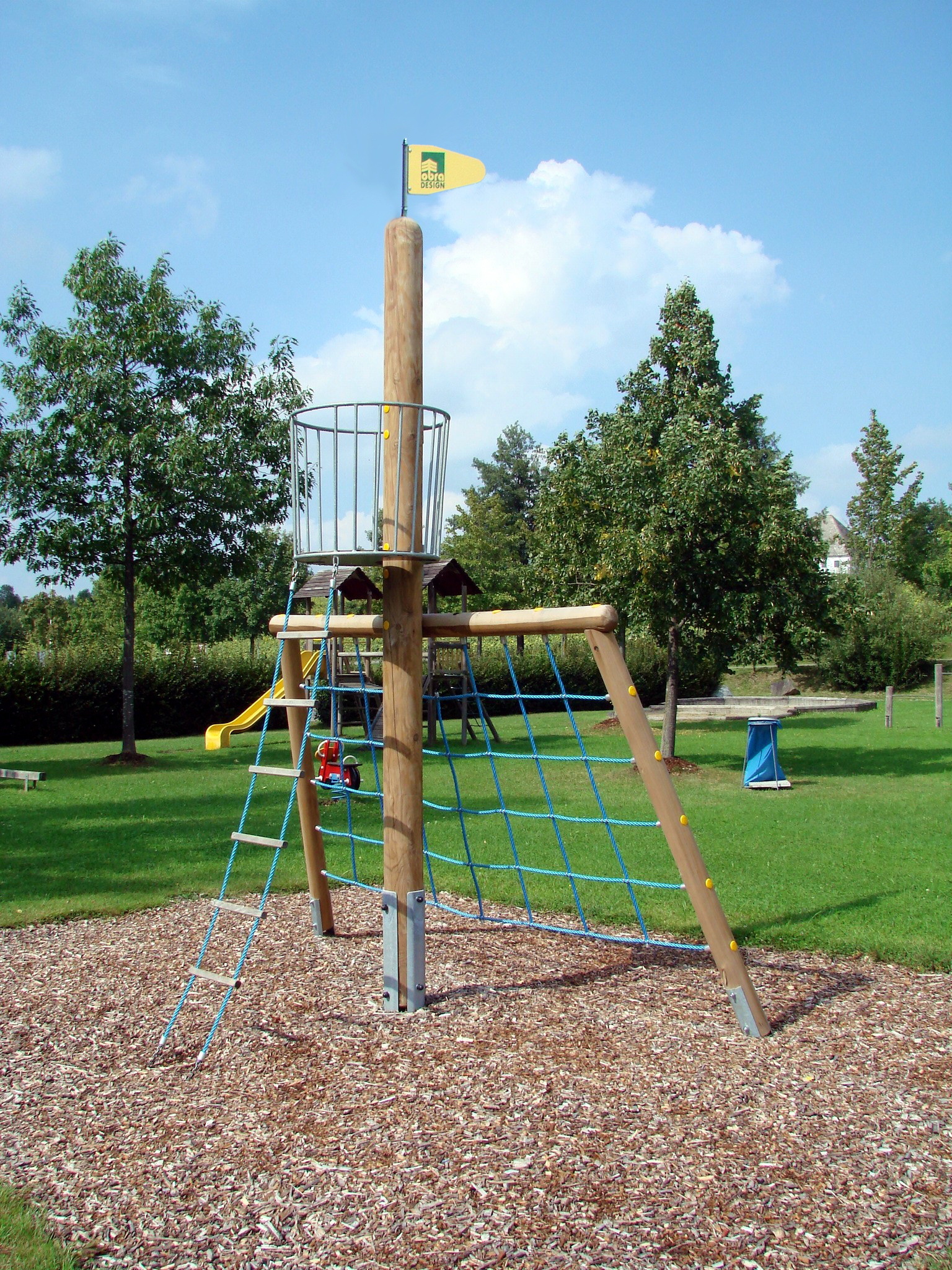 Beschreibung: 1 Mast, Rundholz Ø 20 cm, mit Kern, 1 Kletternetzrahmen aus Rundhölzern, 1 Mastkorb, 1 Strickleiter, 1 Wimpel drehbar auf dem Mast, 1 Kletternetz.