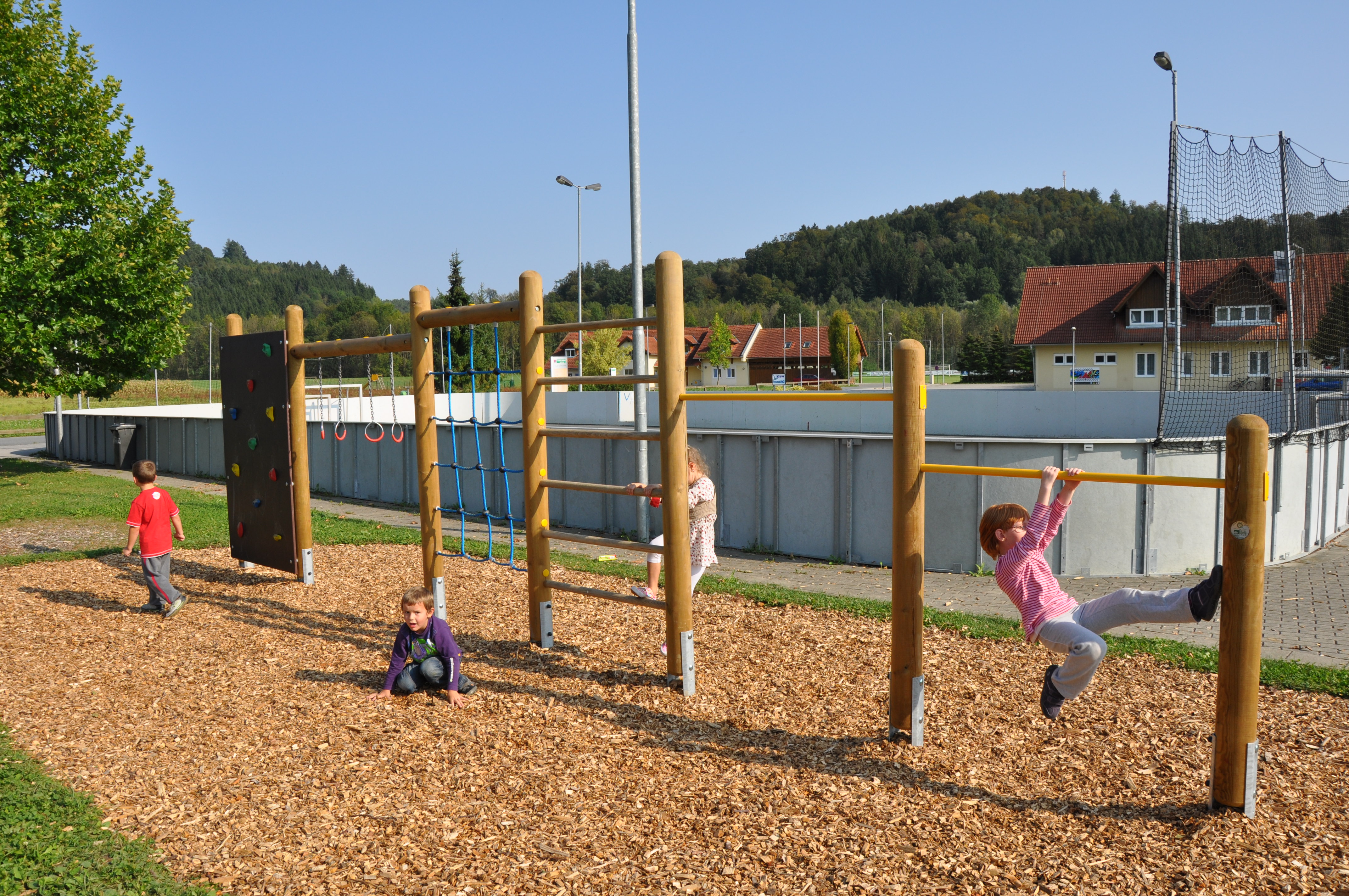 Zum Beispiel beim Spielen auf einem Klettergerüst werden die Muskulatur des Rückens, der Schultern, der Arme und Beine gefordert.