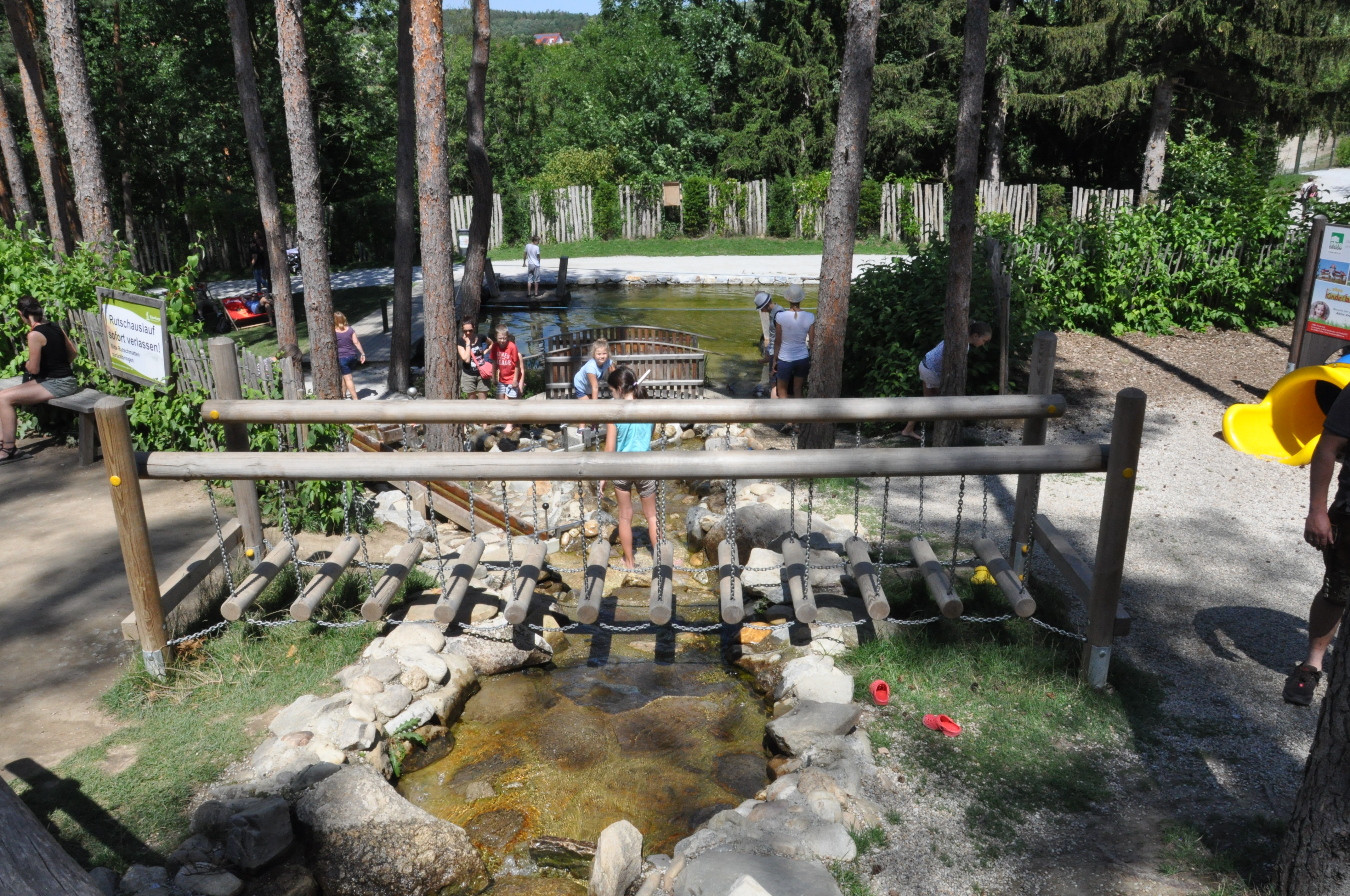Auf dem Kettensteg balancieren wir mit Armen, Körper und Beinen, um den unerwarteten Bewegungen der Rundhölzer gegeneinander zu folgen. Ein beidseitiges Geländer gibt Haltemöglichkeiten. Von dem Geländer sollte aber möglichst wenig Gebrauch gemacht werden. Obwohl keine Gefahr besteht, ins Wasser zu fallen, steigert dieser „Gang über dem Abgrund“ die Empfindungen des freien Balancierens.