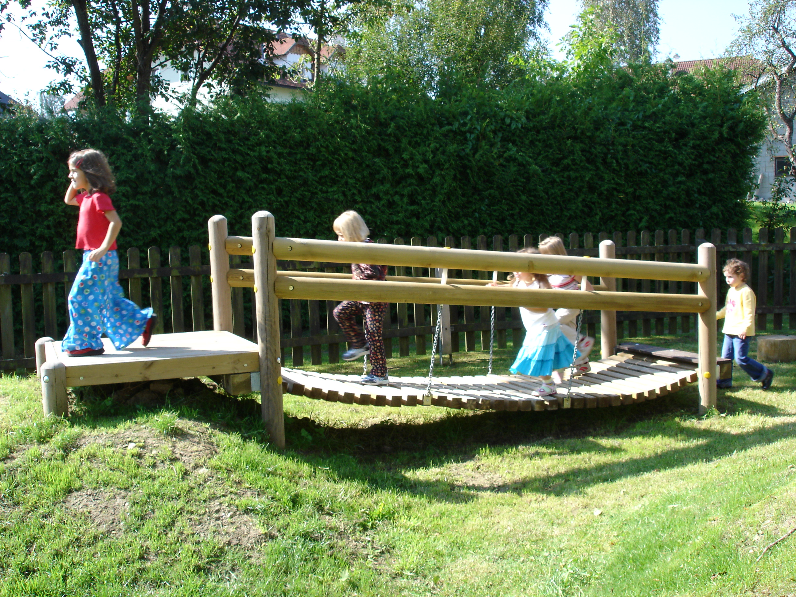 Beschreibung: 4 Steher (Pfosten), BSH Ø 16 cm, 2 Längsbalken Ø 12 cm, 2 Leitern aus 2 Holmen, Kantholz 9/9 cm, Sprossen Ø 4,5 cm, Esche, 2 Podeste, Wackelbrückenbelag aus Kanthölzern, an 2 Längsketten mit Spannvorrichtungen, dazwischen Distanzscheiben aufgefädelt, 2 Handlaufketten, Kettenabspannungen im Abstand von ca. 1 m.
