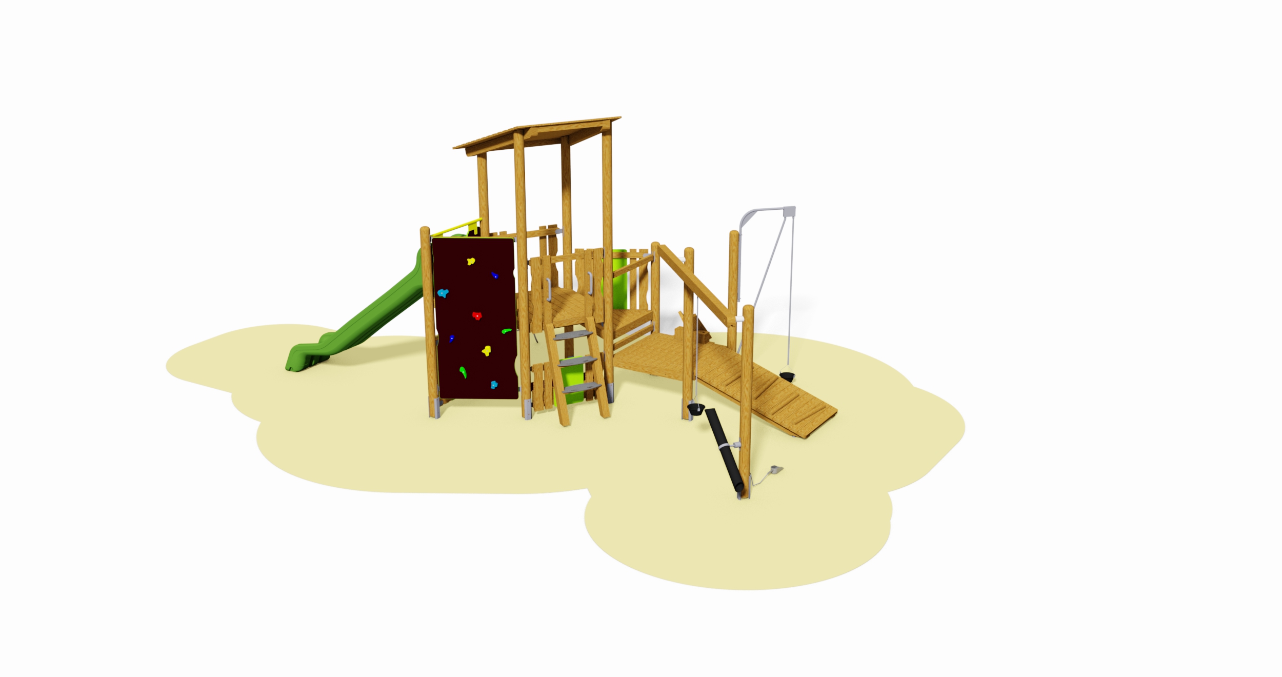 9 Steher, 2 Viereckpodeste, 2 Dreieckpodeste, 5 Handläufe, 1 Pultdach, 1 Leiter, 1 Bergsteiger-Kletterwand senkrecht, 1 Netzeinstieg ohne Rahmen, 1 Rampe , 1 Brüstung, 2 Brüstungen für steile Aufstiege, 1 Absturzsicherung für Rutsche, 1 Sandrinne v-förmig, 1 Sandaufzug schwenkbar in Edelstahl mit Sandbehälter aus Gummi, 1 Sandtransport mit Laufschiene, Kette in Edelstahl und Sandbehälter aus Gummi, 1 Sand-rohr drehbar, 1 Schaufel (Edelstahl) an Kette, 1 Spielwand nieder mit Sitzbank, 1 Paneel mit Zahnrädern aus PE.