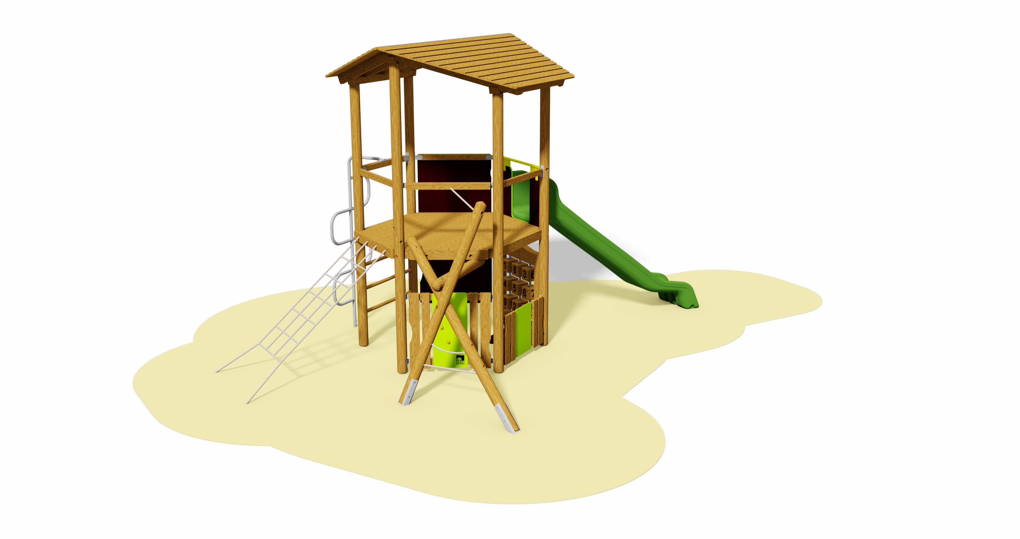 6 Steher, 1 Sechseckpodest, 5 Handläufe, 1 Absturzsicherung für Rutsche, 1 Giebeldach, 1 Bergsteiger-Kletterwand, senkrecht, 1 S-Kletterstange, 1 Stangen-Kletter-Aufstieg, 1 Netzeinstieg ohne Rahmen, 1 Spielwand „Mathe“, 1 Spielwand „Zahnrad“, 1 Spielwand nieder mit Sitzbank.