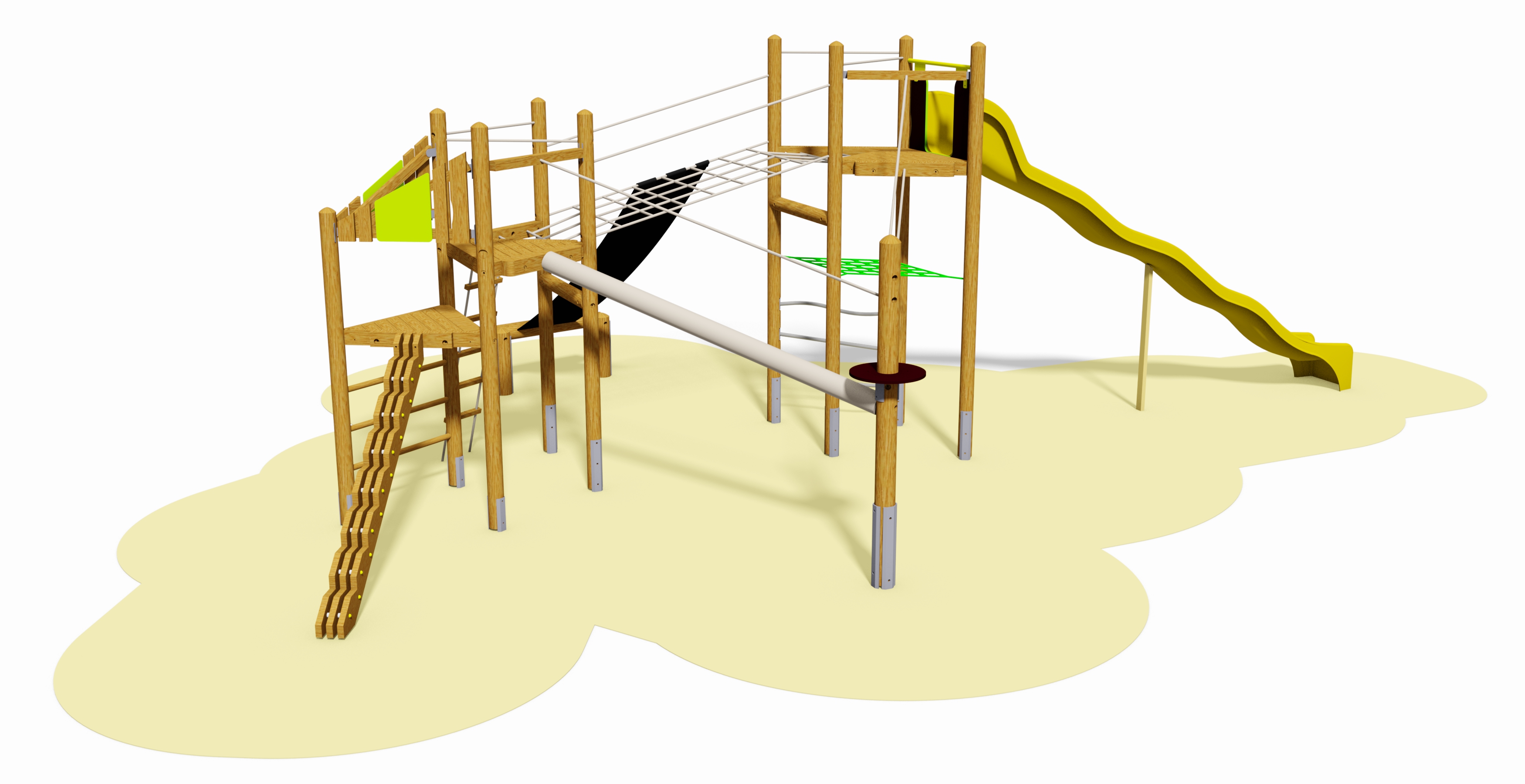 9 Steher Ø 12 cm, 3 Steher Ø 14 cm, 3 Dreieckpodeste, 4 Handläufe, 6 Seilhandläufe, 2 Brüstungselemente schräg, 1 Absturzsicherung für Rutschen, 1 Zwischenleiter, 1 Stufenbaum, 1 Herkules-Flächennetz schräg, 1 Strickleiter, 1 Gummiband-Aufstieg mit Klettergriffen, 3 Edelstahlsprossen, 1 Relaxnetz, 2 Herkules-Halteseile Ø 22 mm, 1 Herkules-Blanciertau Ø 22 mm, 1 Kokostau (Polypropylen) Ø 150 mm.