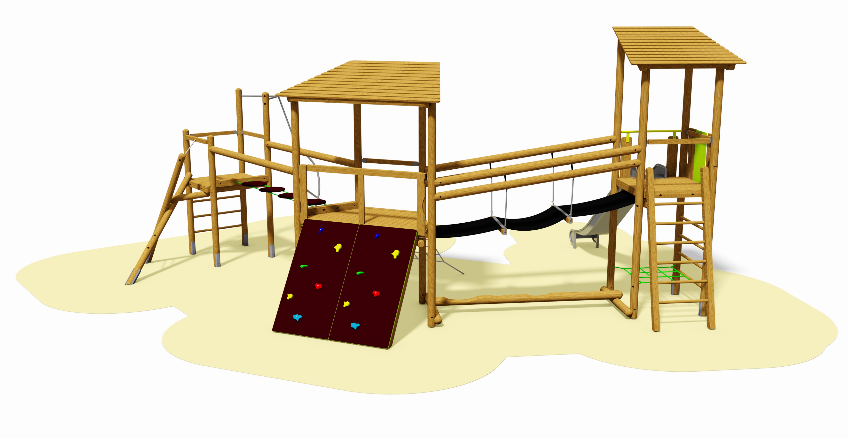 11 Steher (Pfosten), 1 Sechseckpodeste, 1 Viereckpodest, 6 Handläufe, 2 Brüstungen, 1 Absturzsicherung für Rutschen, 1 Sechseck-Zeltdach aus profilierter Schalung, 1 Leiter, 1 Feuerwehr-Kletterstange, 1 Bergsteiger-Kletterwand, 1 Stangen-Aufstieg, 1 Helix-Netz, 1 Tau-Übergang, 1 Spielwand Tante-Emma-Laden, 1 Spielwand mit Tür, 1 Spielwand hoch mit Sitzbank und Blasenfenster, 1 Fahne aus HPL-Platte, 1 Haltegriff in Edelstahl.