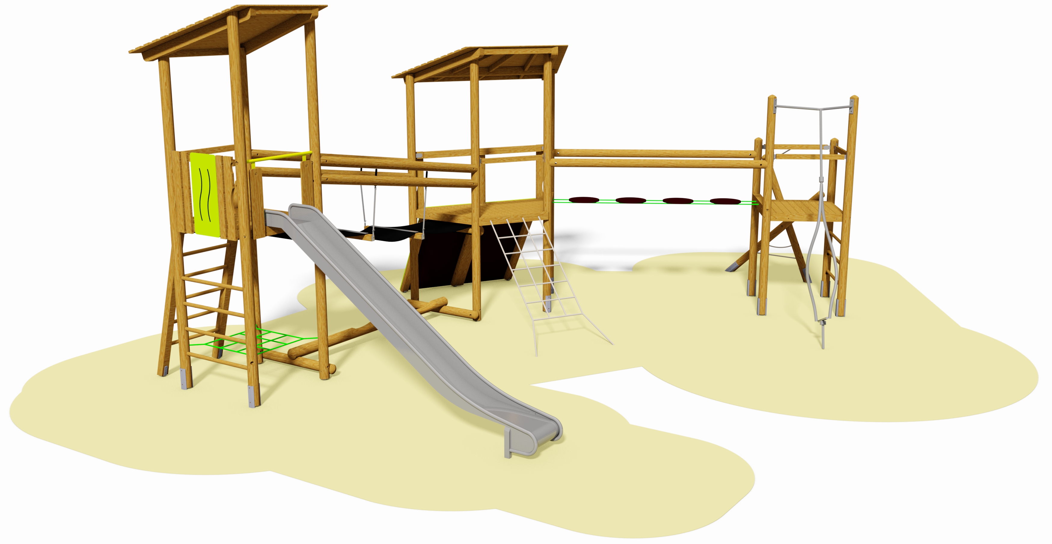 12 Steher, 2 Viereckpodeste, 1 Trapezpodest, 7 Handläufe, 1 Brüstungselement, 1 Absturzsicherung für Rutschen, 2 Pultdächer aus Schichtholzplatte, mit Sparren und Pfetten, 1 Leiter, 1 doppelte Bergsteiger- Kletterwand schräg, 1 Netzeinstieg ohne Rahmen, 1 Stangen-Kletter-Aufstieg, 1 Wackelteller-Brücke, 1 Gummibahn-Brücke, 1 Relax-Netz, 1 Balancierbalken, 1 Drehwurm in Edelstahl, mit 1 Kugellager unten, 1 Gleitlager oben.