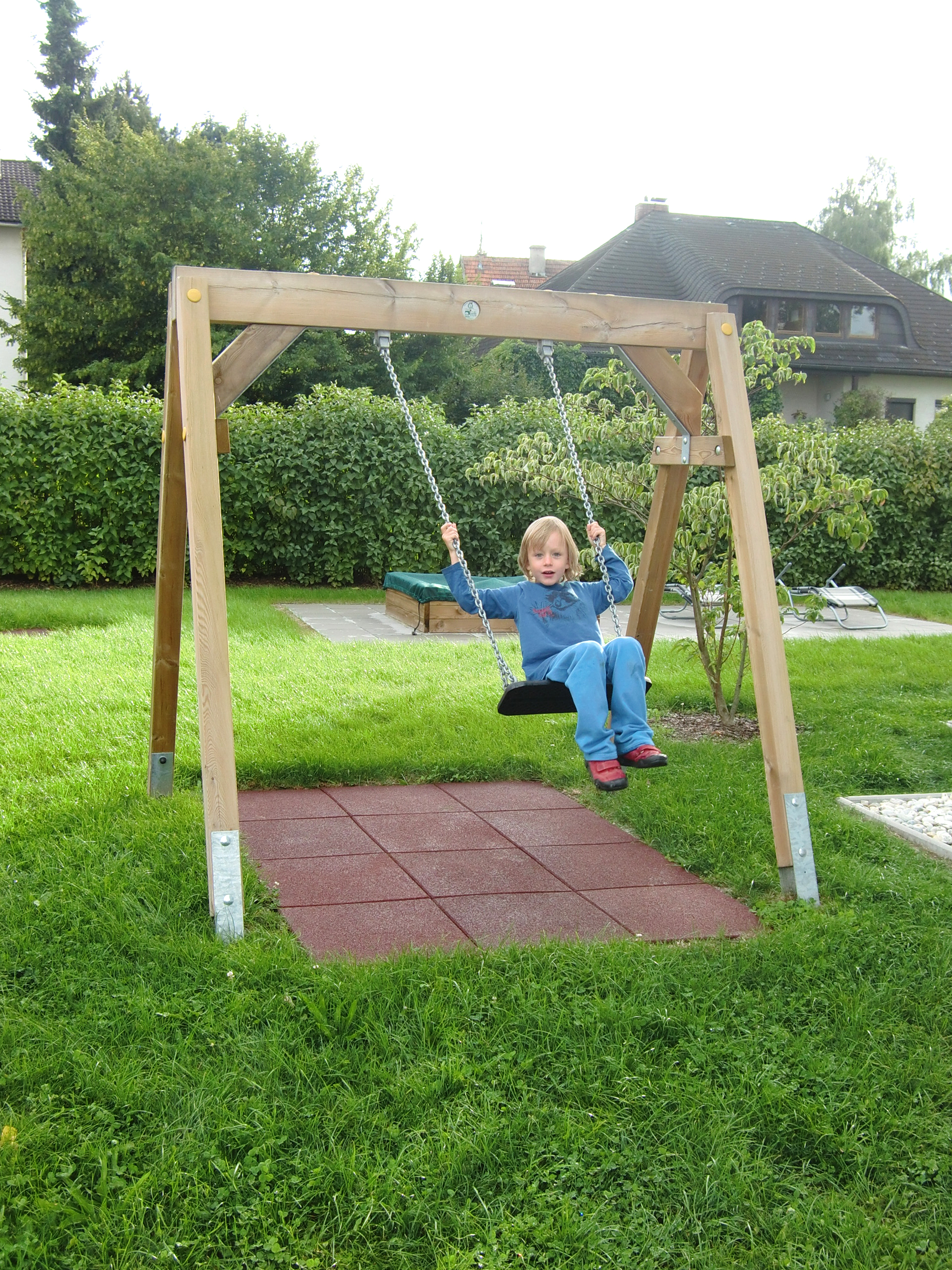 Eine Schaukel sollte auf keinem Spielplatz fehlen. Die Einfachschaukel verfügt über einen Sicherheitsschaukelsitz. Die Schaukel ist am Schaukelgerüst mittels Ketten an Gleitlagern abgehängt.