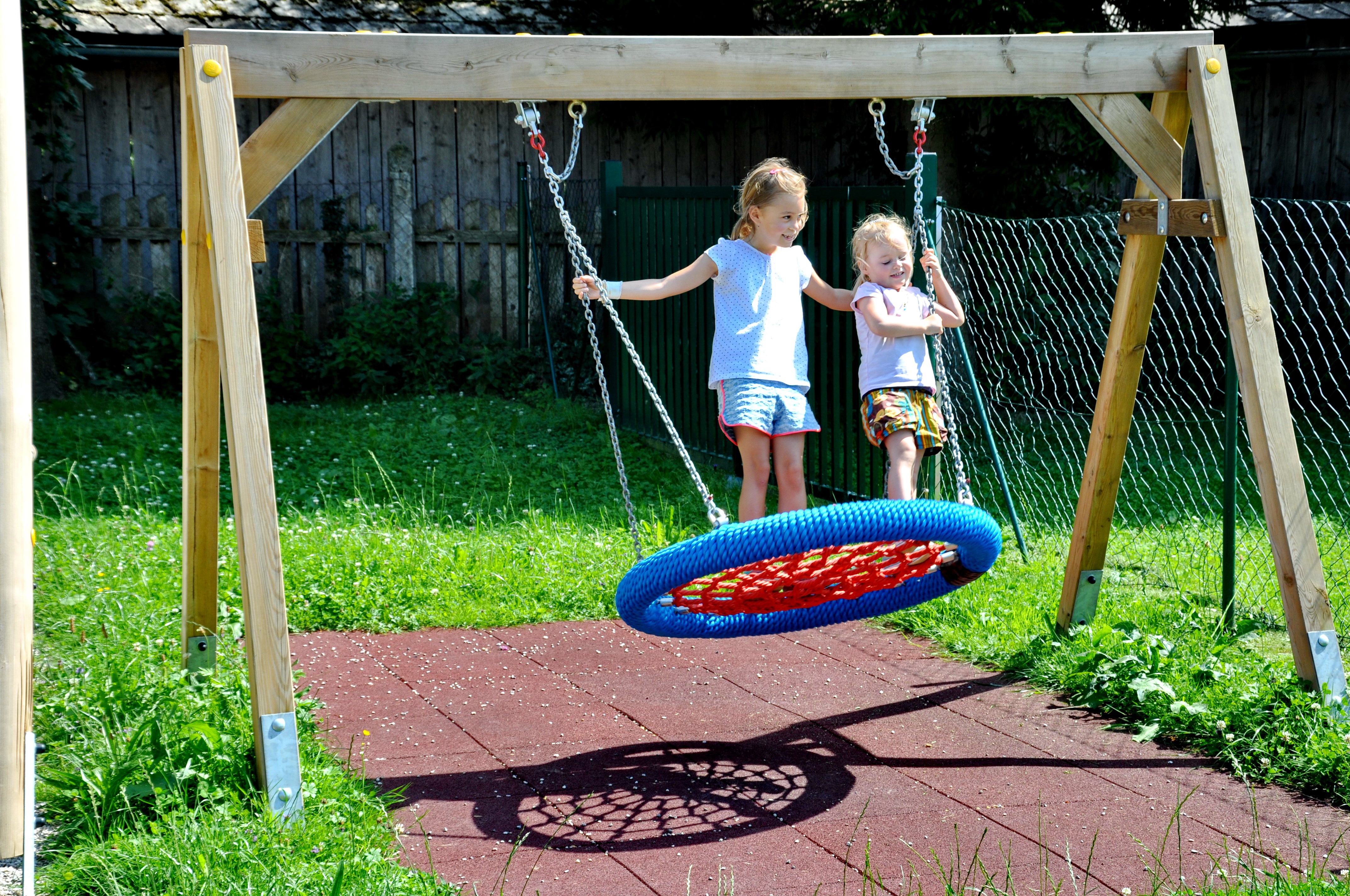 Ring- bzw. Nestschaukeln bieten die Möglichkeit im Liegen, Sitzen oder Stehen zu schaukeln. Darüber hinaus können mehrere Kinder miteinander schaukeln wodurch die Interaktion gefördert wird. Die obra eco Ringschaukel verfügt über einen Schaukelkorb mit Ø 90 cm aus einem massiven Stahlring mit Seilumwicklung. Die Sitzfläche besteht aus einem Gummigeflecht. Die Schaukel ist am Schaukelbalken mittels Ketten und Sicherungsketten an Kugellagern abgehängt.