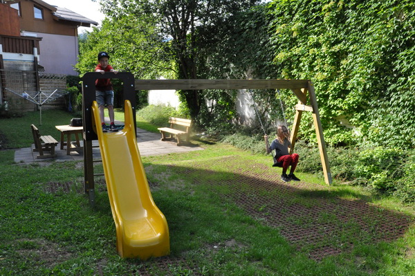 • Das Spielgerät obra eco Rutschbock mit Einfachschaukel
