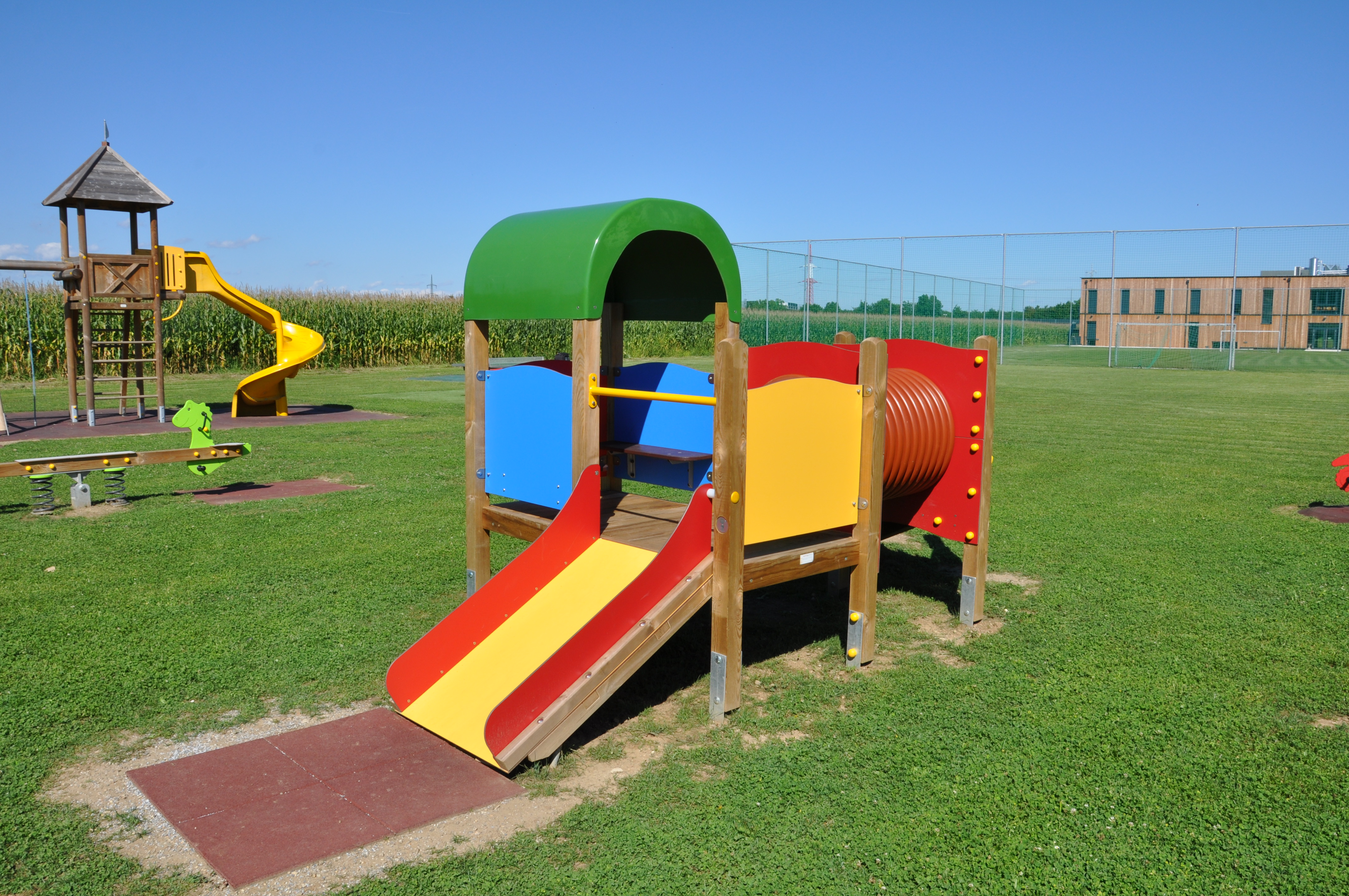 Das obra mini Sternchen sollte durch die niedrige Podest Höhe für die ganz kleinen sehr attraktiv wirken. Durch den Aufstieg über die Rampe kommt man auf den Dreieck- Turm der was mit einem Kriechtunnel mit dem zweifach Viereck- Turm mit Tonnendach verbunden ist. Hier ergibt sich die Möglichkeit sich auf den 2 Brüstungselementen mit montierter Sitzbank nieder zu lassen, um sich gegenseitig Geschichten zu erzählen zu können. Neben den Sitzbänken gibt es auch noch ein Bubble-Fenster-Paneel wo man die Kinder dadurch im Außenbereich Beobachten kann. Zur Ausübung der motorischen Fähigkeit ist im Dreieckturm ein Schiebe-Aktiv-Paneel zu finden.