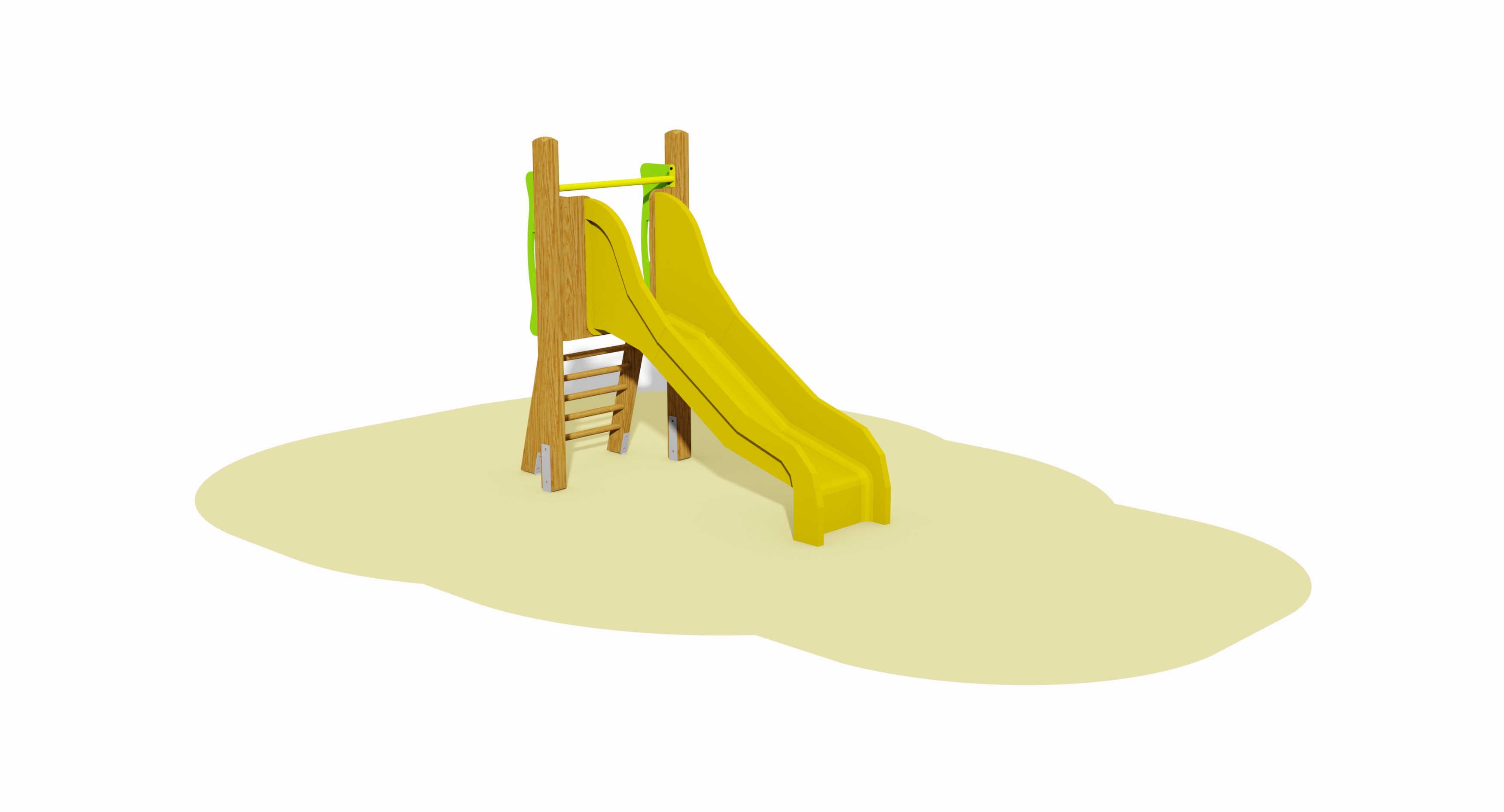 2 Steher (Pfosten), 1 Querholm aus Kantholz 9x9 cm, 1 Absturzsicherung für Rutsche, 1 Handlauf, 1 Leiter, 2 Seitenplatten aus HDPE mit Grifföffnungen.