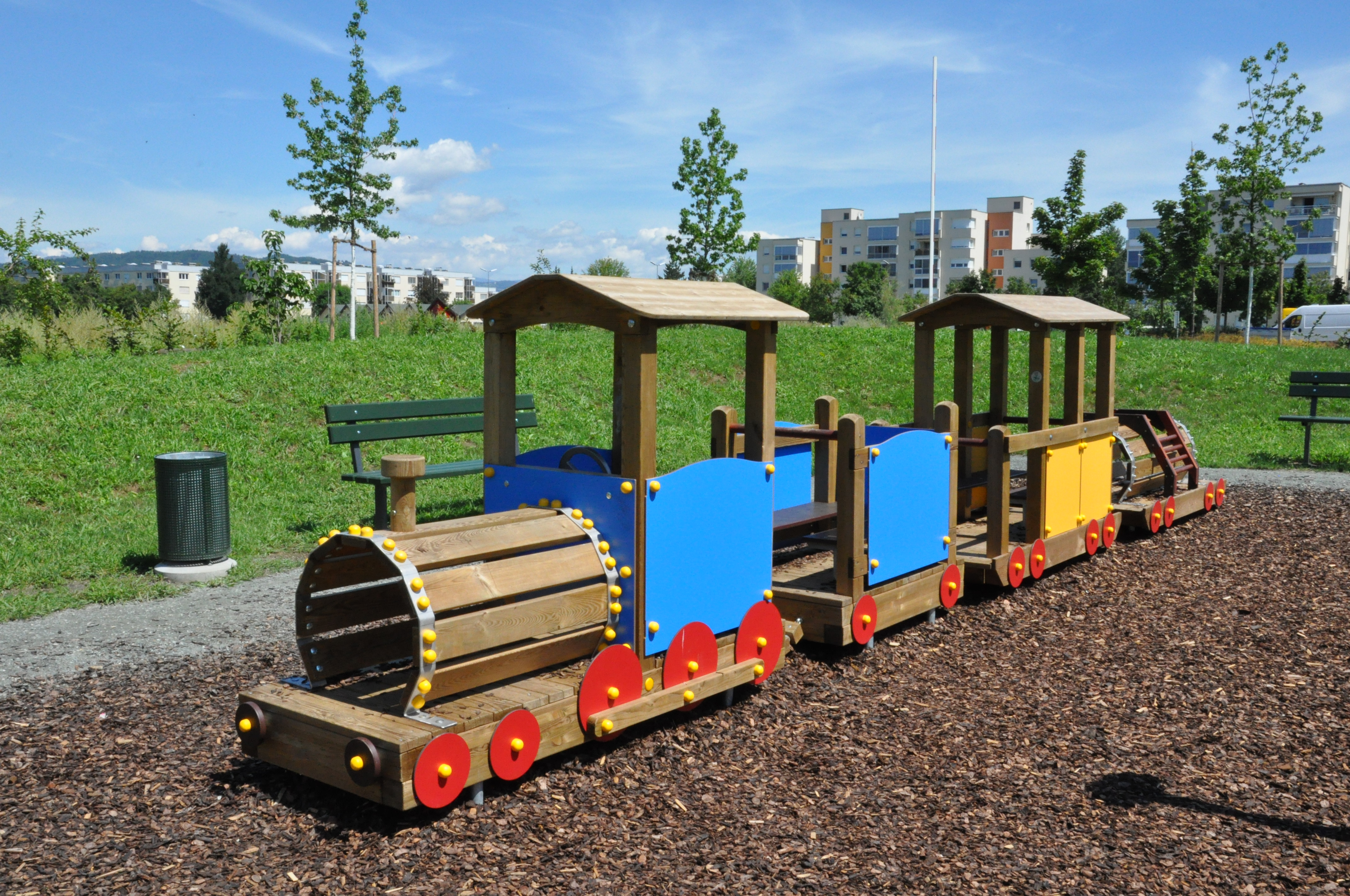 Beschreibung: Podeste aus KH 9/17 cm, Belag KH 3,5 x 10 cm genutet, 16 Steher (Pfosten), Kessel aus Stahlbögen mit Kanthölzern verkleidet, 3 Handläufe aus Eschensprossen Ø 4,5 cm, 1 Spielelement mit Lenkrad, 6 Brüstungselemente, 2 Dächer aus Dreischichtplatten. Der Zug wird in Bauteilen vormontiert geliefert.